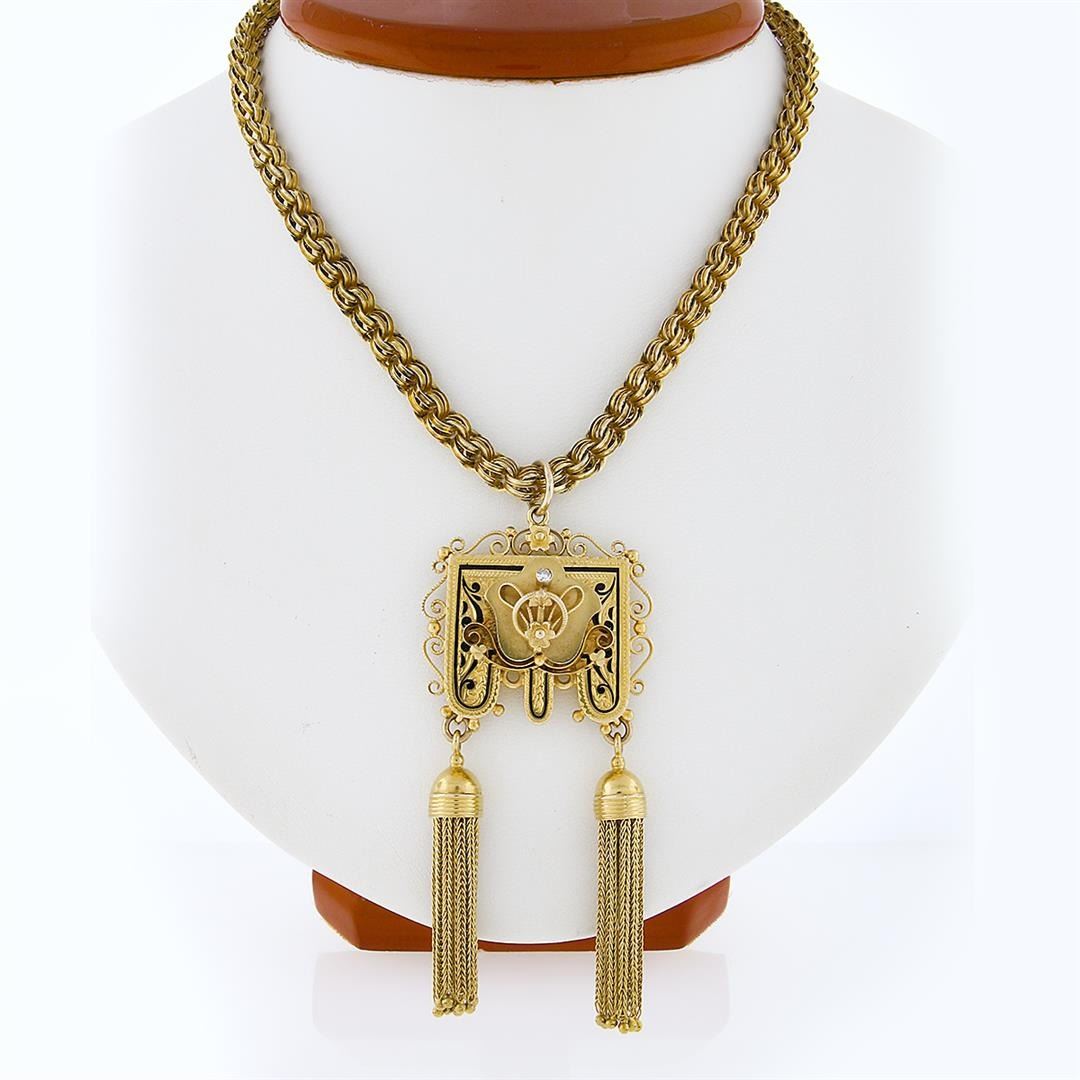 A solid 14k yellow gold tassel pendant necklace, with enamel work & 1 old single cut natural diamond (G - VS2 ; 0.05ct). 24.5 inch fancy interlocking dual circle link chain, 47.11 grams total weight, pendant measures 83.80x34.15mm.