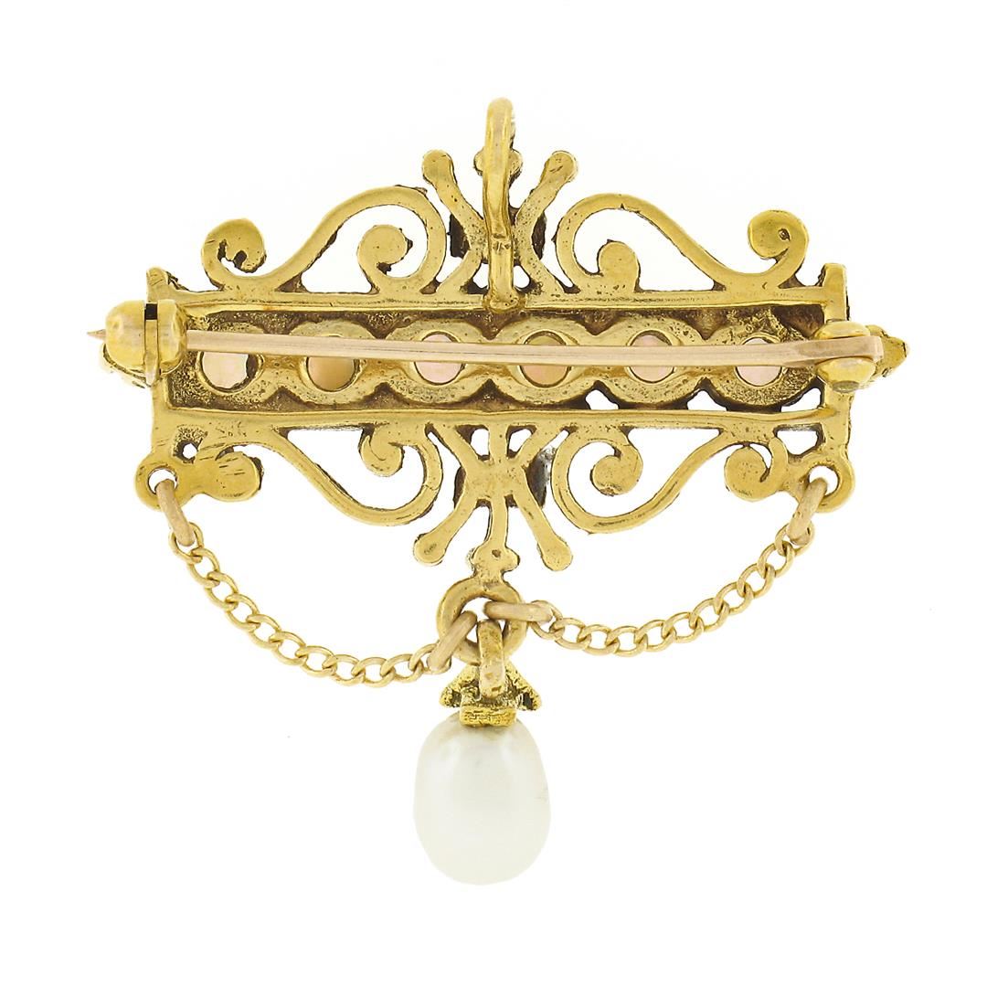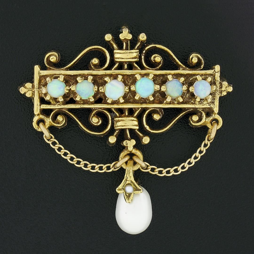A solid 14k yellow gold dangle brooch pendant, with 6 round cabochon cut natural opals (3mm each), and 1 bead shape cultured seed pearl (1.4mm), with 1 egg shape cultured pearl (7.75x5.65mm). Measures 31.80x32.60mm and weighs a total of 7.66 grams.
