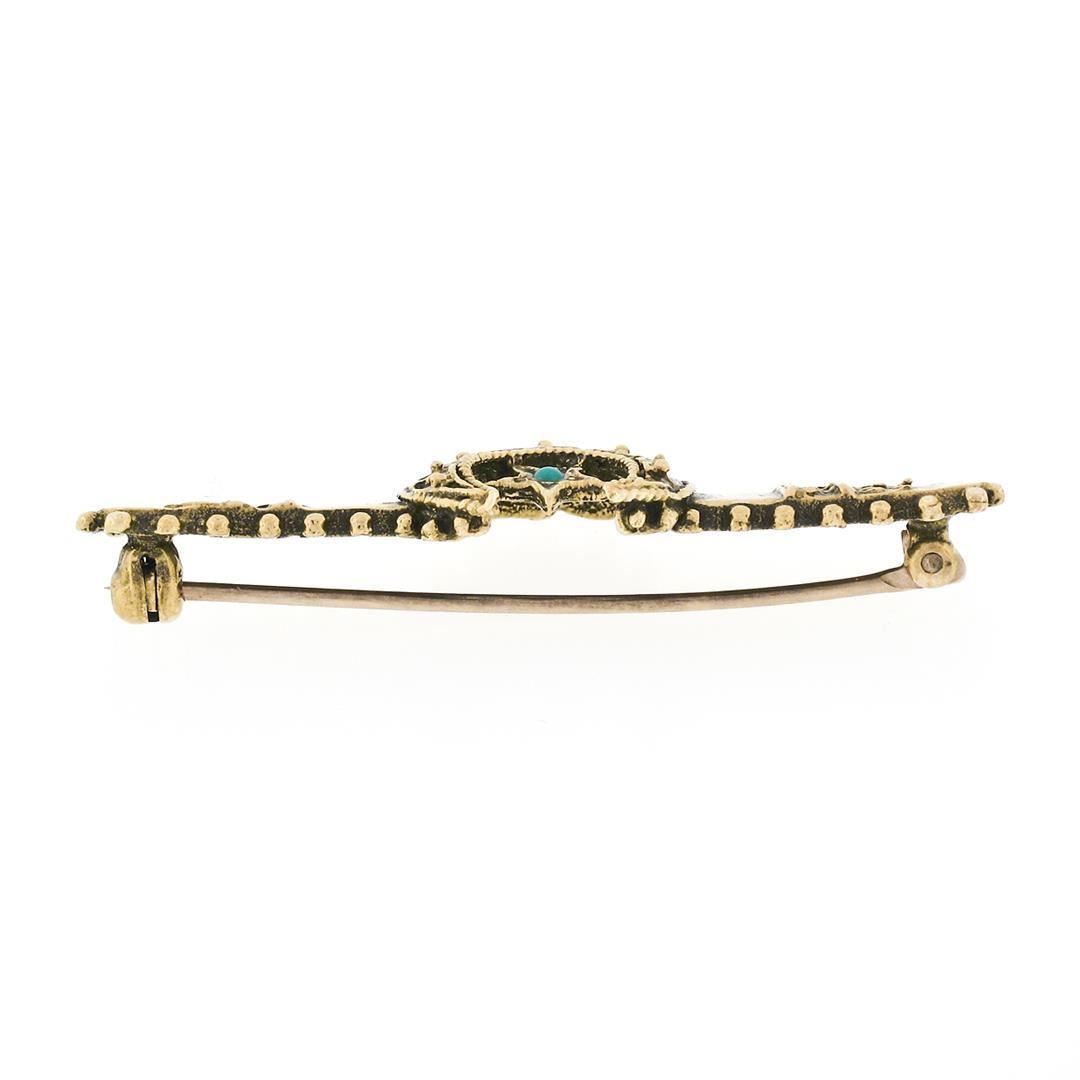 A vintage vicotrian revivial 14k yellow gold bar bpin brooch, with 1 round cabochon cut natural truquoise (1.70mm). Measures 13.47x41.13mm and weighs a total of 3.70 grams.