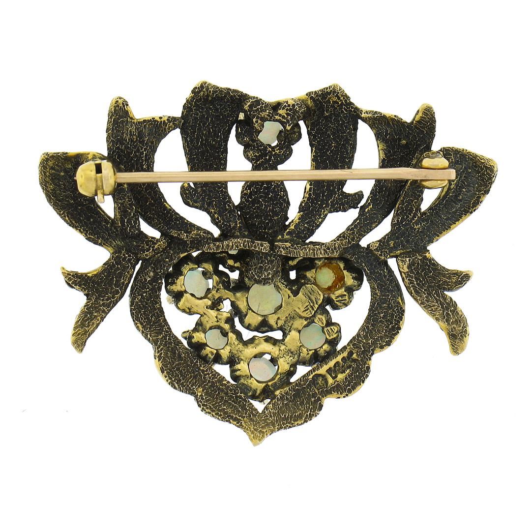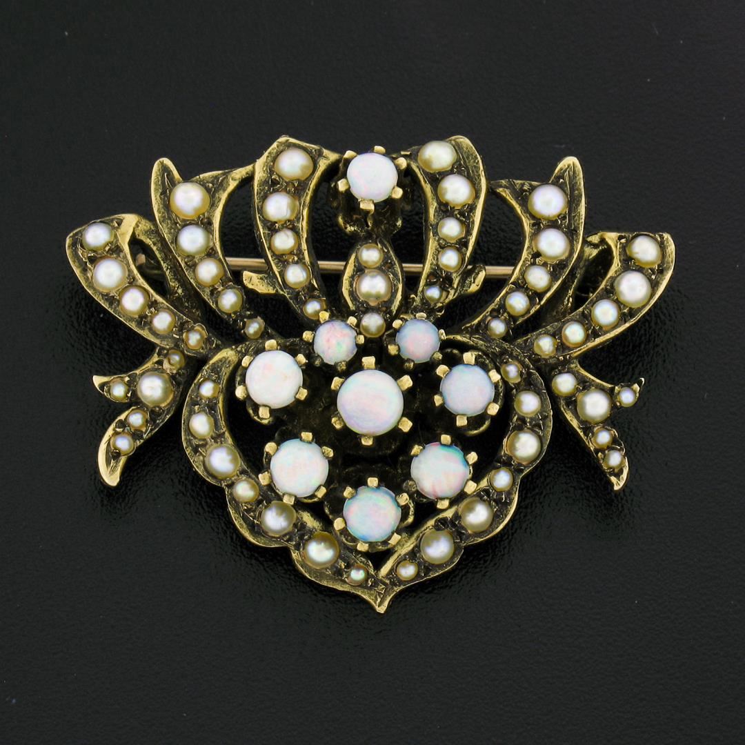 A vintage solid 14k yellow gold brooch, with 9 round cabochon cut natrual opals ( 2.85 to 3.85 mm each), & numerous of round bead shape cultured seed pearls. Measures 29x36.5mm and weighs a total of 8.65 grams.