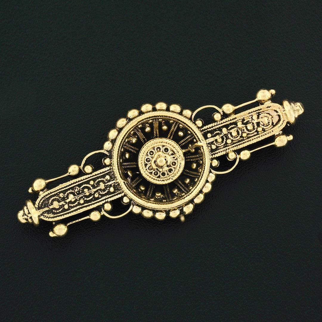 A vintage victorian revival solid 14k yellow gold bar pin brooch. Measures 18.8x48.6mm and weighs a total of 10.01grams.