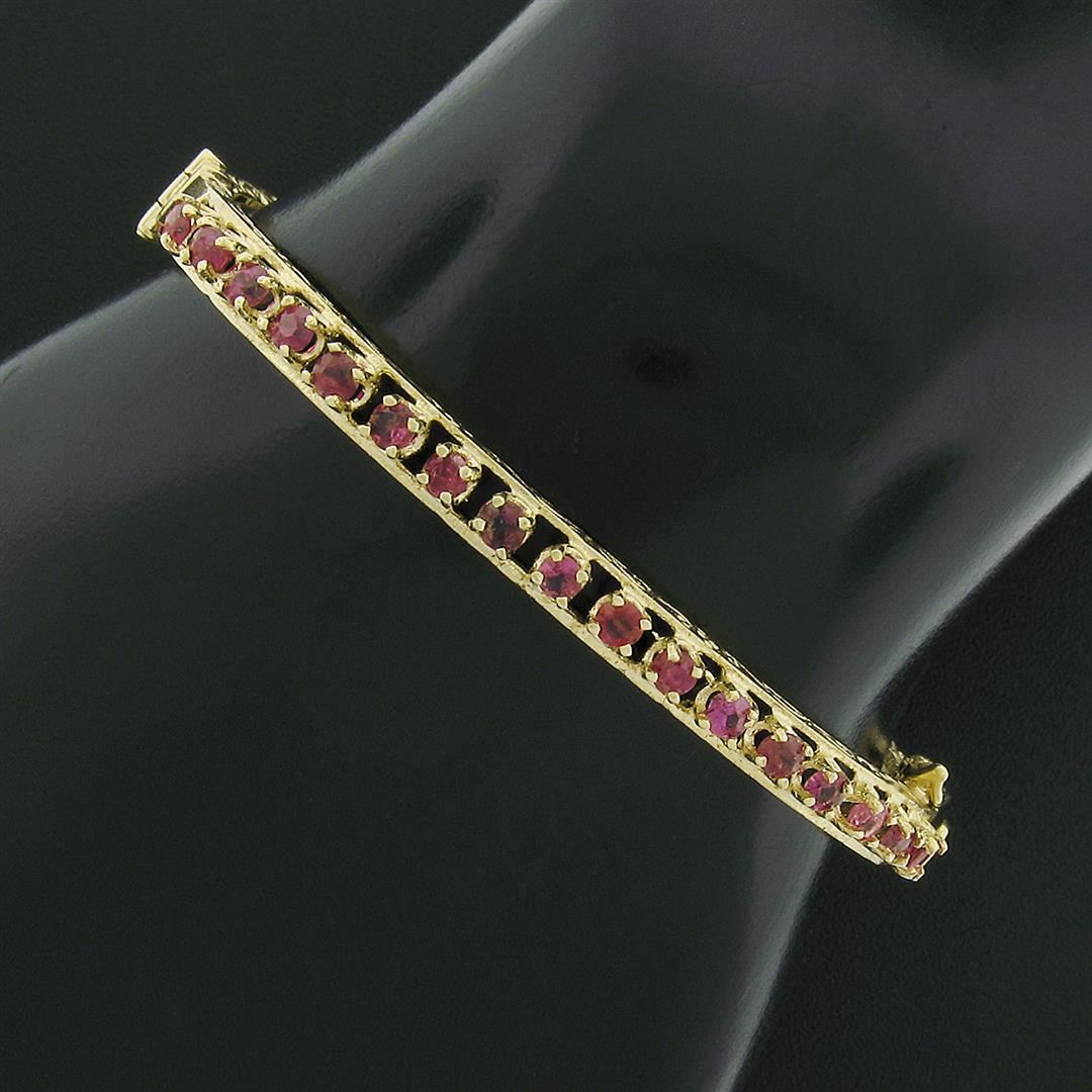 A solid 14k yellow gold bangle bracelet, with 17 round brilliant cut natural rubies (2.00ctw). It weighs a total of 11.13 grams, measures 4.60mm wide, and measures 6 inches in length.