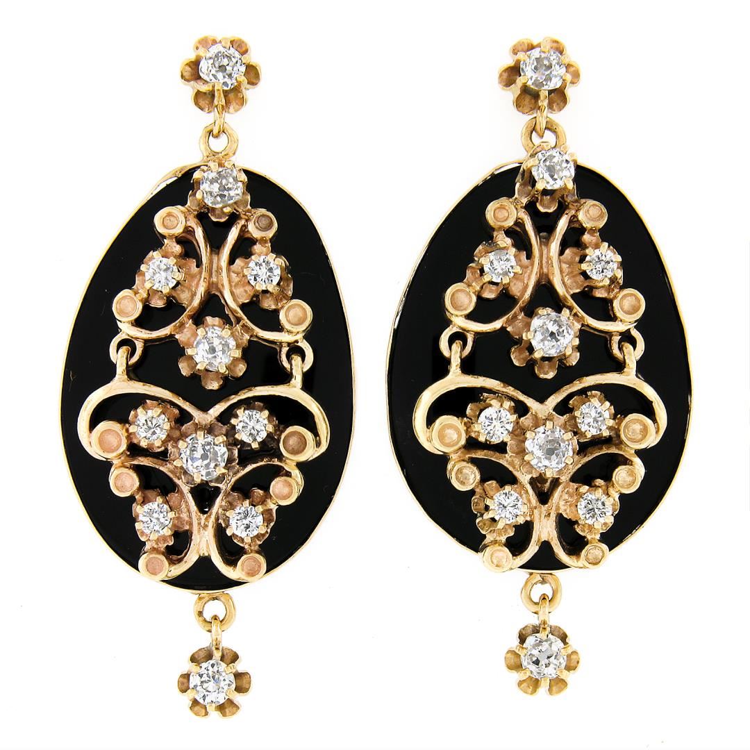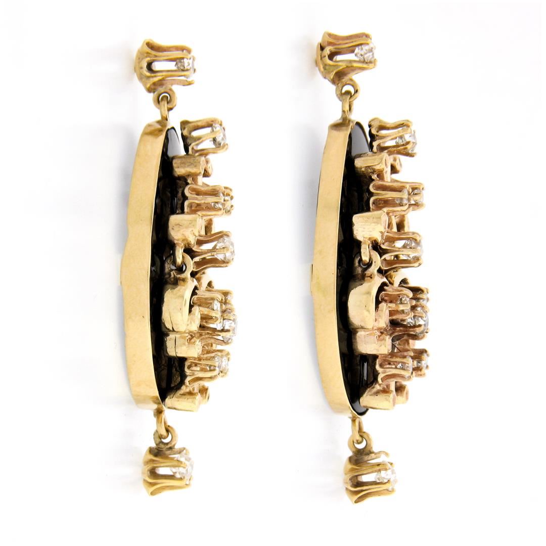 A vintage solid 14k yellow gold dangle earrings, with 2 oval cut natural black onyx (27.6x20.3mm), and 22 old cut natural diamonds (H/I - VS2/SI1 ; 1.70ctw). The earrings measure approximately 44.8x20.80mm and weigh a total of 19.11 grams.