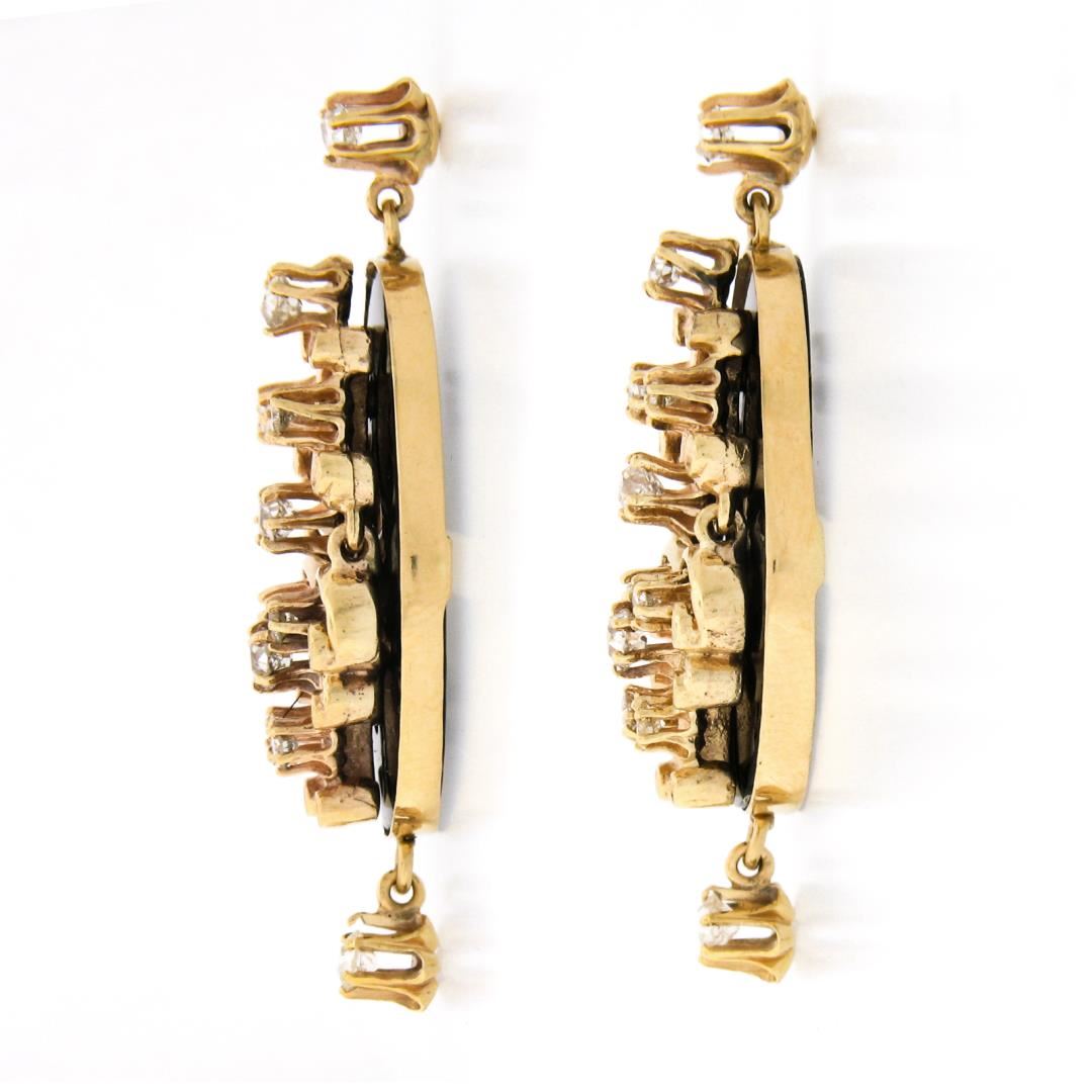 A vintage solid 14k yellow gold dangle earrings, with 2 oval cut natural black onyx (27.6x20.3mm), and 22 old cut natural diamonds (H/I - VS2/SI1 ; 1.70ctw). The earrings measure approximately 44.8x20.80mm and weigh a total of 19.11 grams.