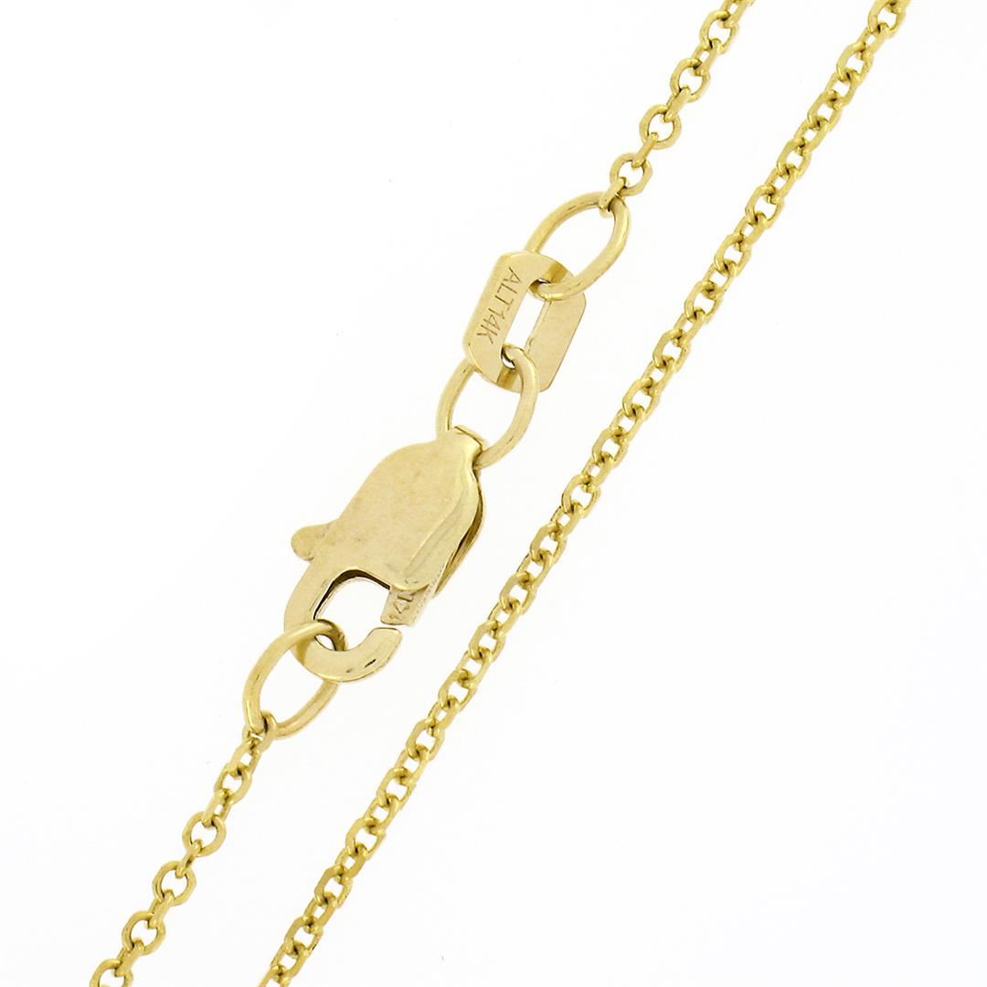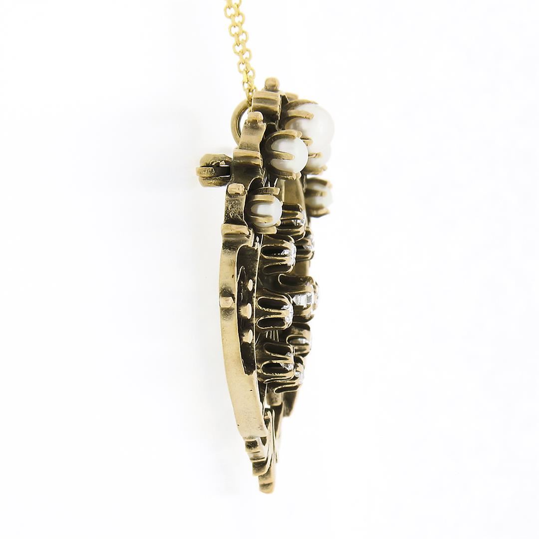 A solid 14k yellow gold pin brooch pendant necklace, with 9 old transitional cut natural diamonds (F/G - VS1/VS2 ; 0.34ctw), and 5 round shape cultured pearls (2.5-4.4mm). Measures 36.45x32.60mm and weighs a total of 11.29 grams and 18 inch cable link cha