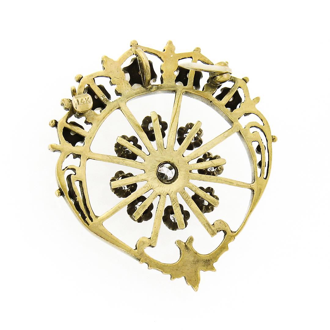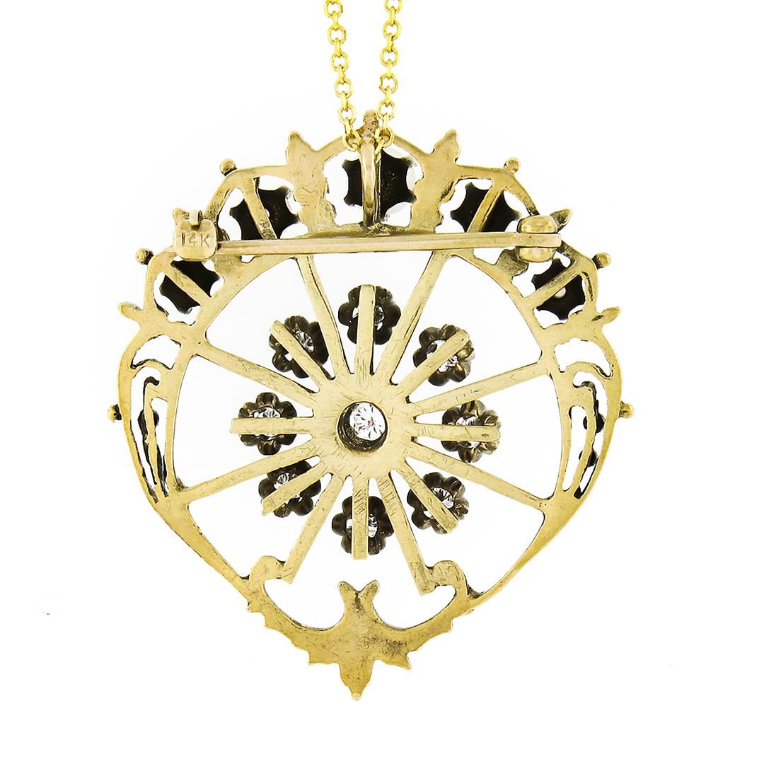 A solid 14k yellow gold pin brooch pendant necklace, with 9 old transitional cut natural diamonds (F/G - VS1/VS2 ; 0.34ctw), and 5 round shape cultured pearls (2.5-4.4mm). Measures 36.45x32.60mm and weighs a total of 11.29 grams and 18 inch cable link cha