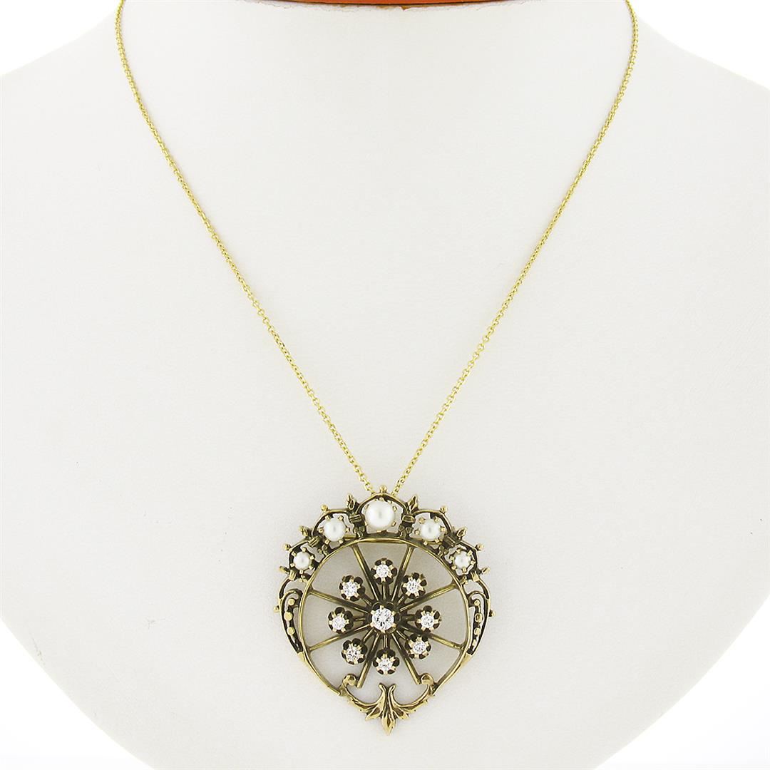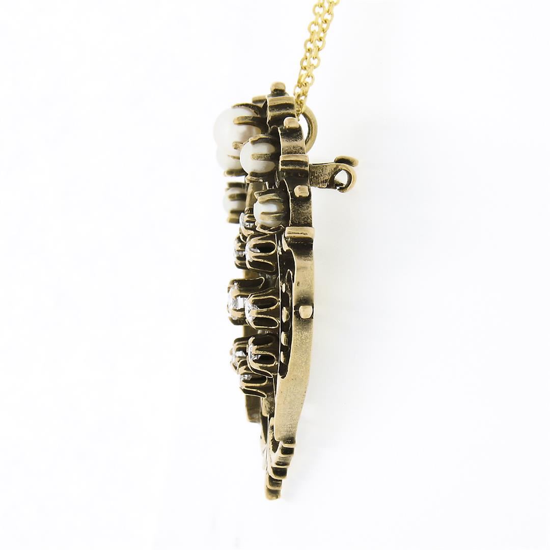 A solid 14k yellow gold pin brooch pendant necklace, with 9 old transitional cut natural diamonds (F/G - VS1/VS2 ; 0.34ctw), and 5 round shape cultured pearls (2.5-4.4mm). Measures 36.45x32.60mm and weighs a total of 11.29 grams and 18 inch cable link cha