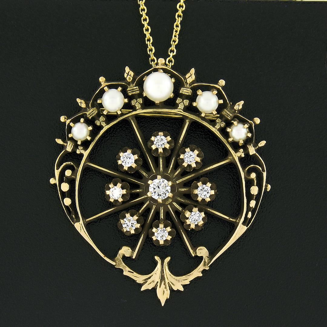 A solid 14k yellow gold pin brooch pendant necklace, with 9 old transitional cut natural diamonds (F/G - VS1/VS2 ; 0.34ctw), and 5 round shape cultured pearls (2.5-4.4mm). Measures 36.45x32.60mm and weighs a total of 11.29 grams and 18 inch cable link cha