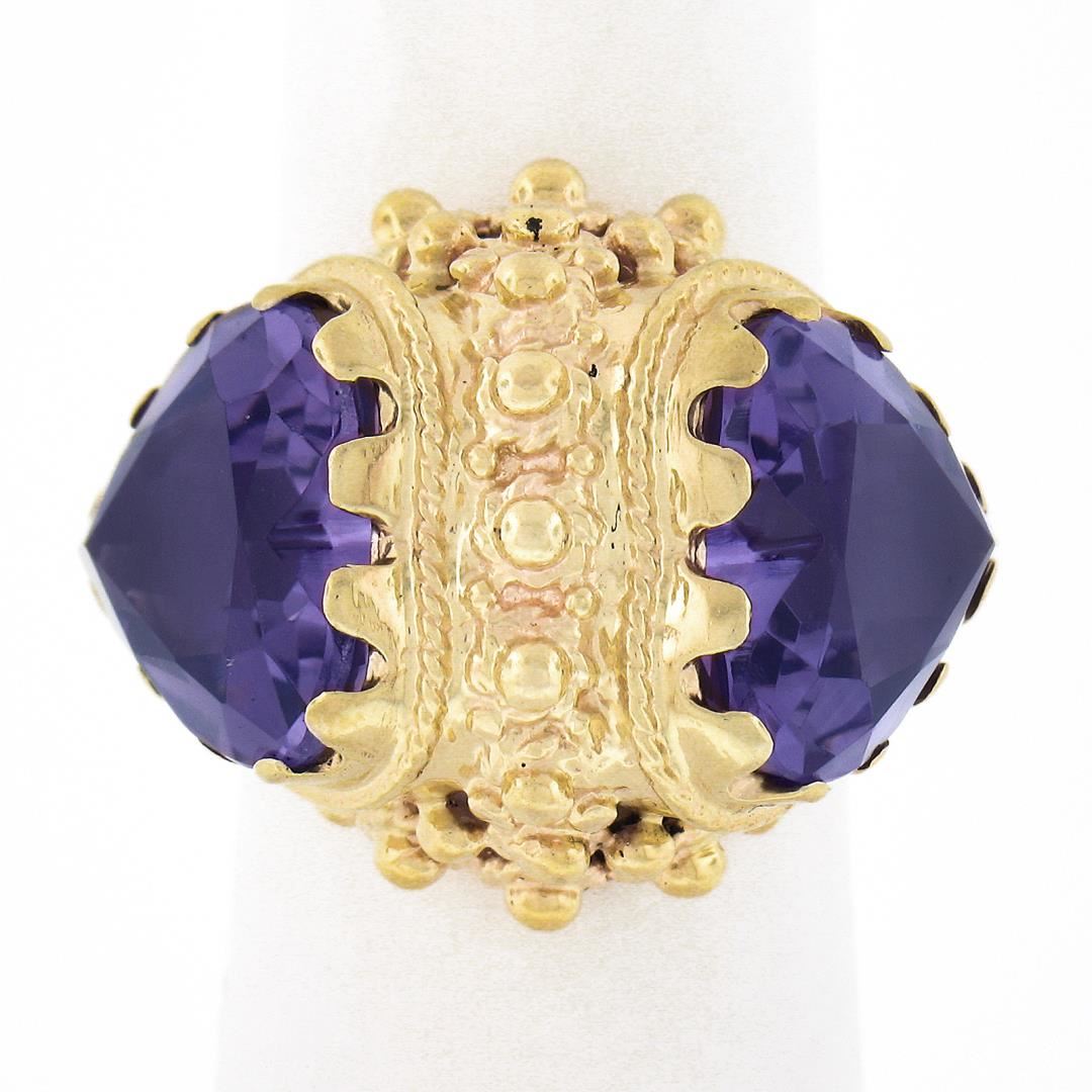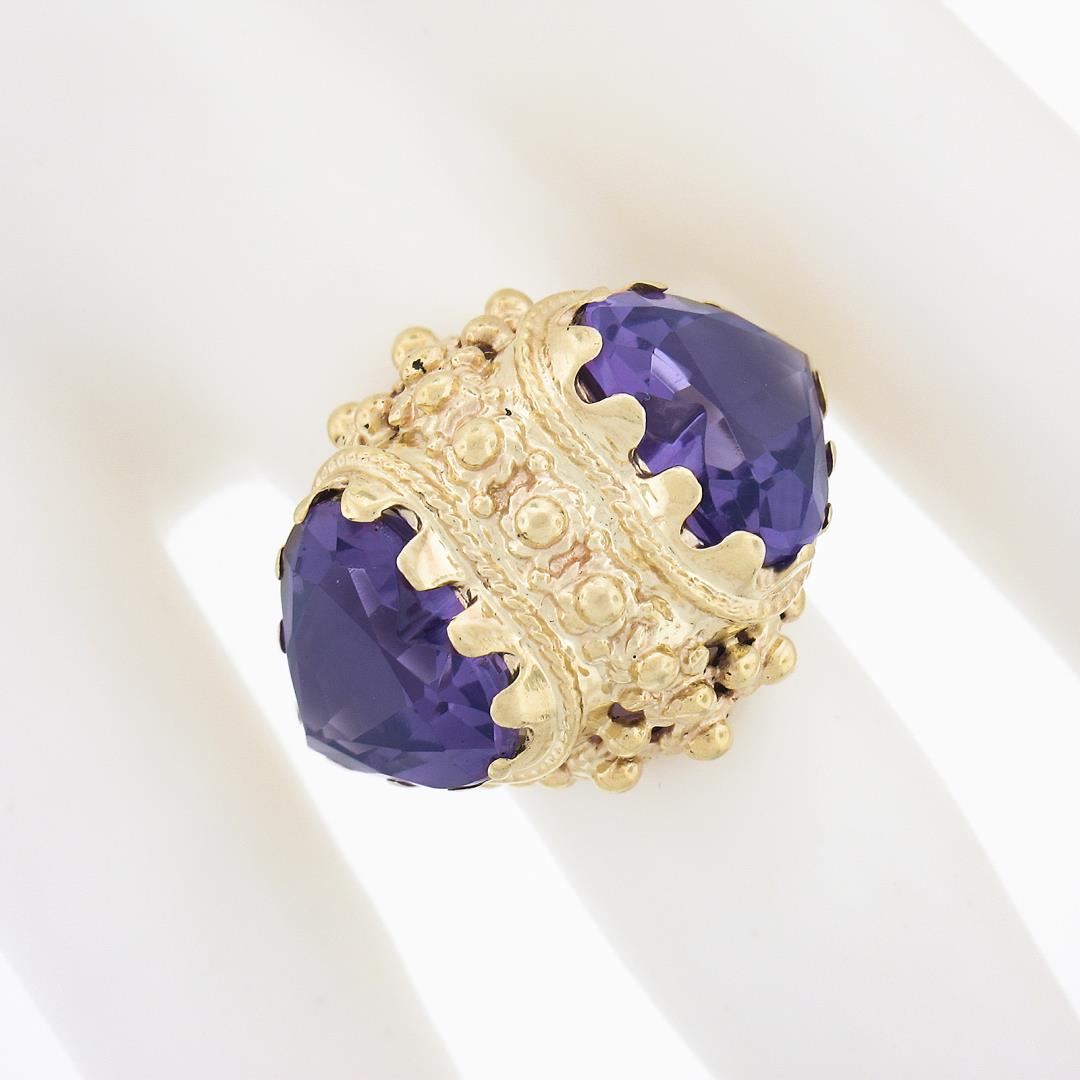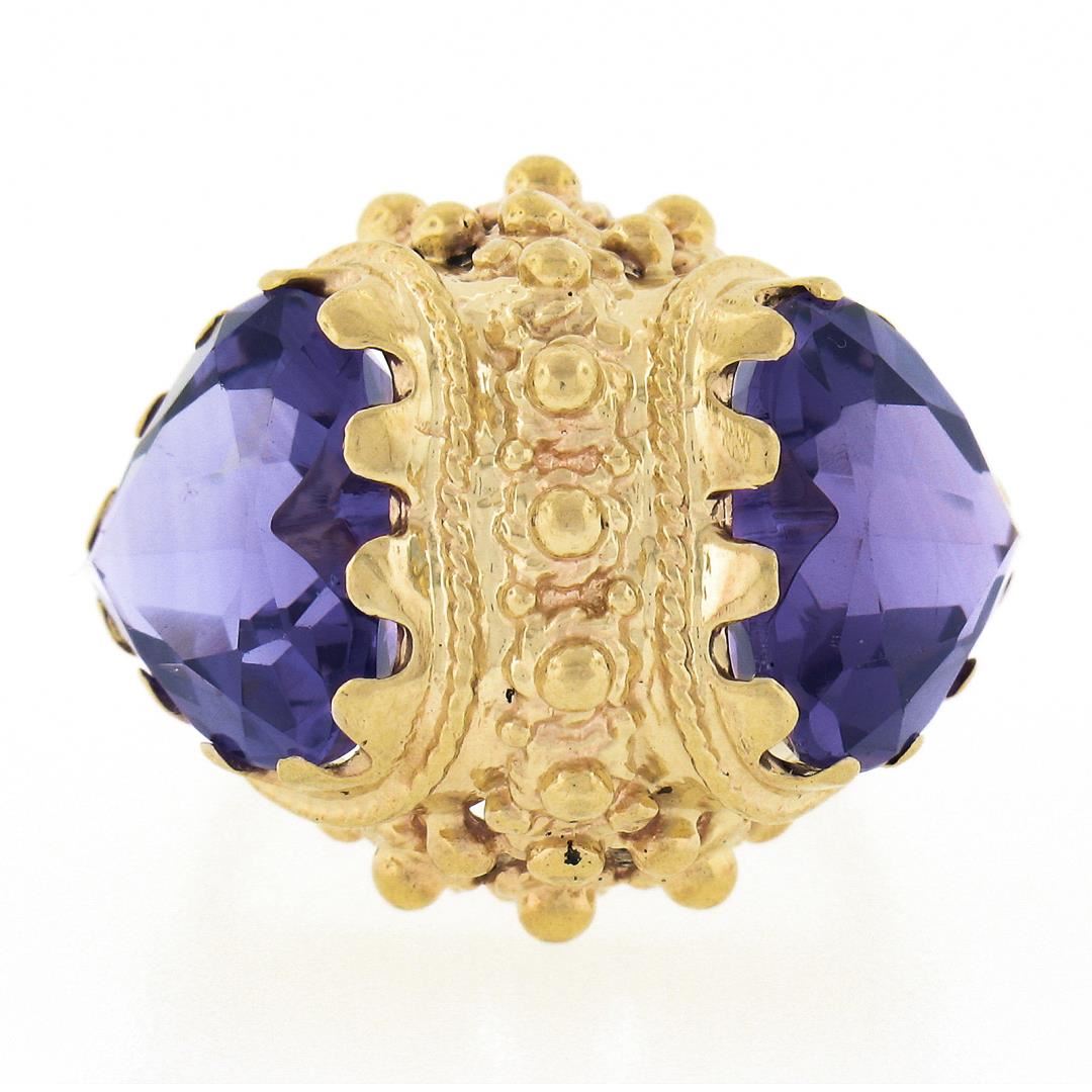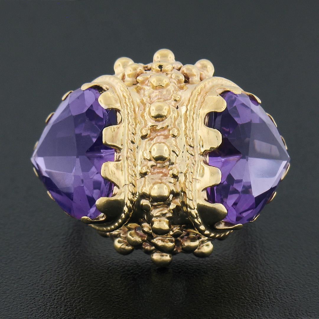A vintage solid 14k yellow gold dome ring, featuring 2 heart cut natural amethysts (12.7x11.8mm each). The ring is size 5.5, weighs a total of 10.52 grams, and measures 20mm wide.