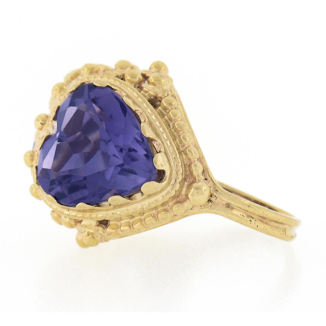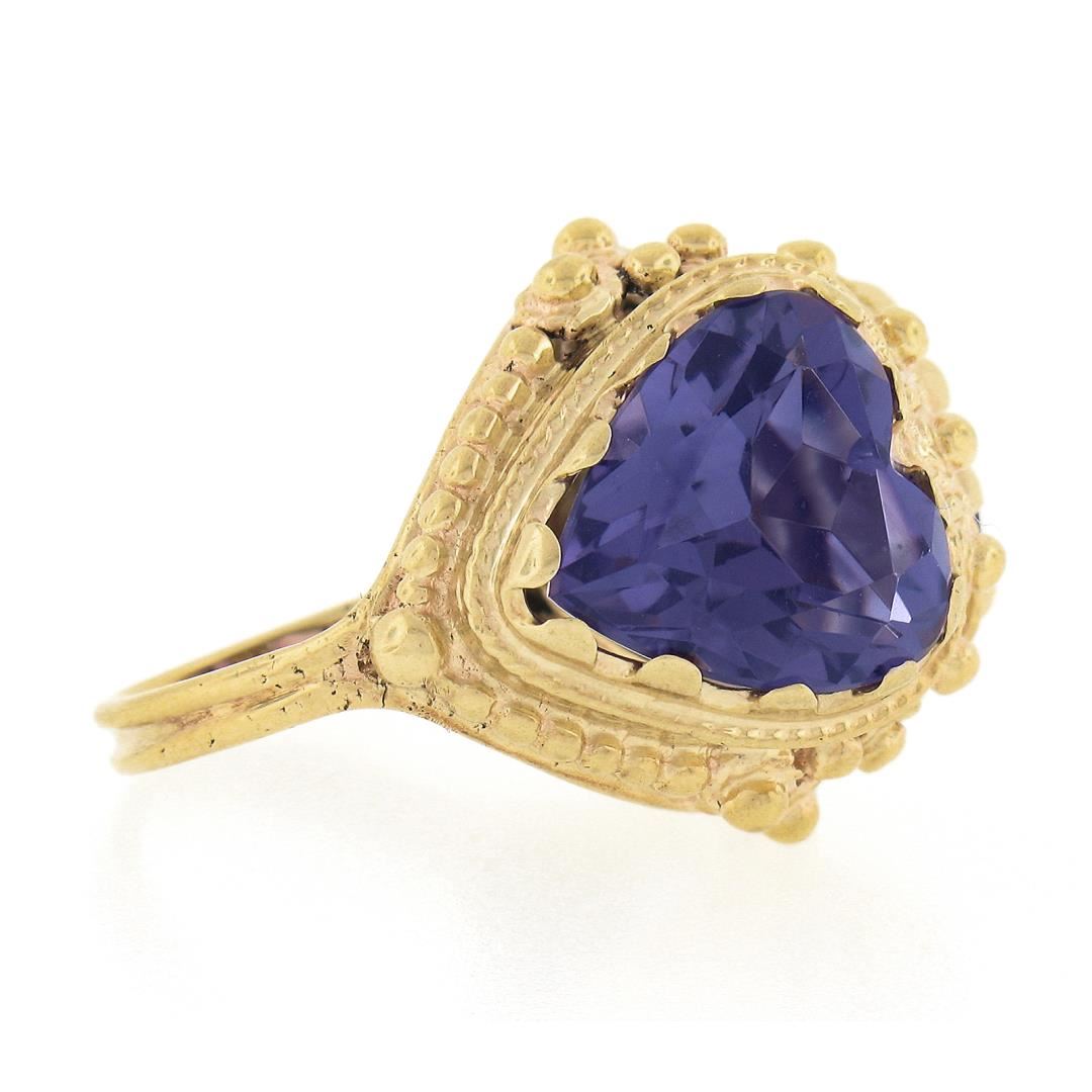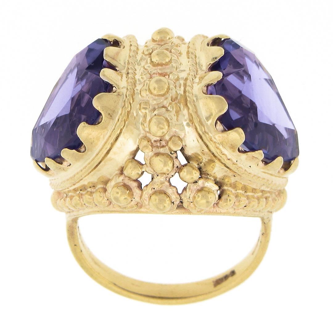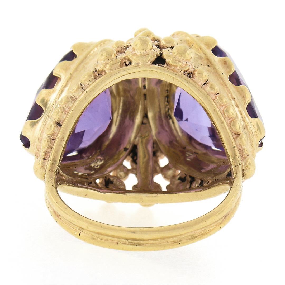 A vintage solid 14k yellow gold dome ring, featuring 2 heart cut natural amethysts (12.7x11.8mm each). The ring is size 5.5, weighs a total of 10.52 grams, and measures 20mm wide.