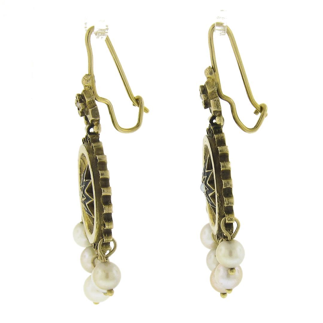A vintage solid 14k yellow gold dangle drop earrings, with 4 round seed pearls (1.4 to 1.8mm ), and 10 round cultured pearls (4.3 to 4.5mm). The earrings measure approximately 43.5x17.1mm and weigh a total of 4.31 grams.