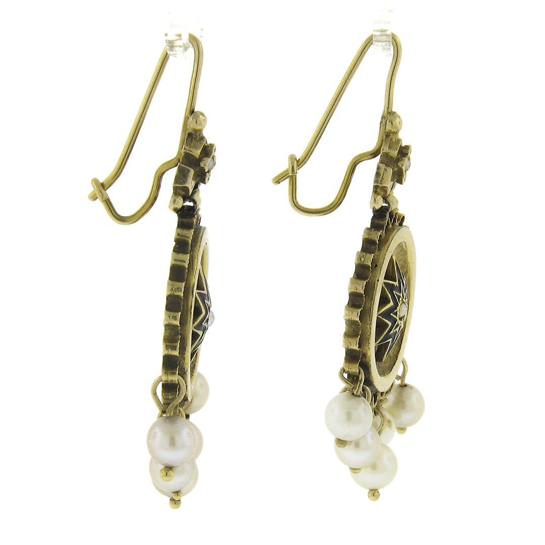 A vintage solid 14k yellow gold dangle drop earrings, with 4 round seed pearls (1.4 to 1.8mm ), and 10 round cultured pearls (4.3 to 4.5mm). The earrings measure approximately 43.5x17.1mm and weigh a total of 4.31 grams.