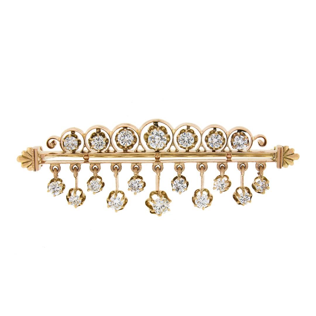 A vintage solid 14k rosy yellow gold dangle brooch, with 18 round and old transitional cut natural diamonds (G-I - SI1-I1 ; 3.26ctw). Measures 24x70.7mm and weighs a total of 15.56 grams.