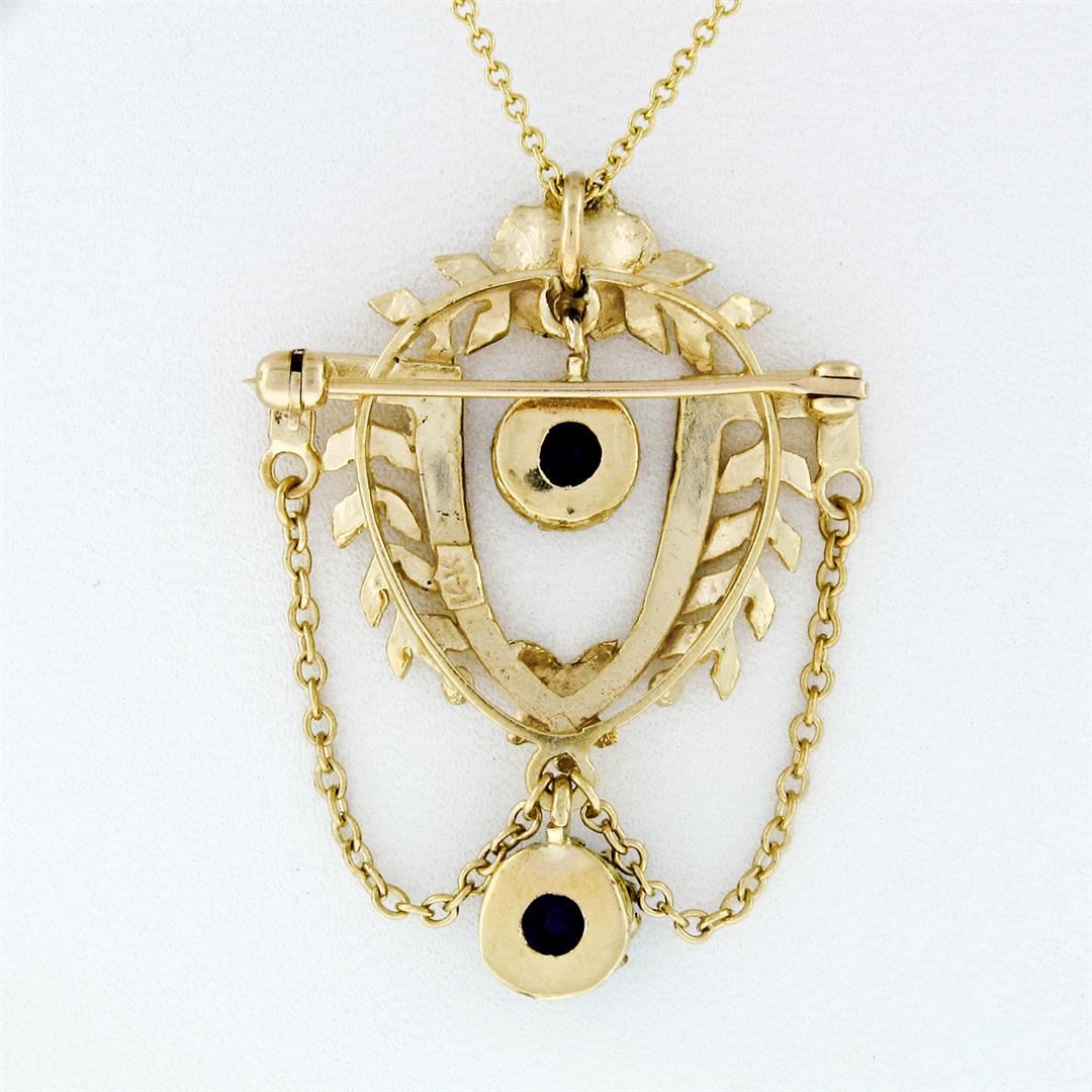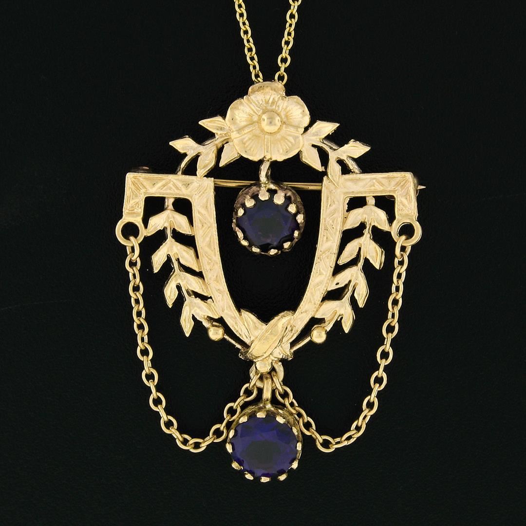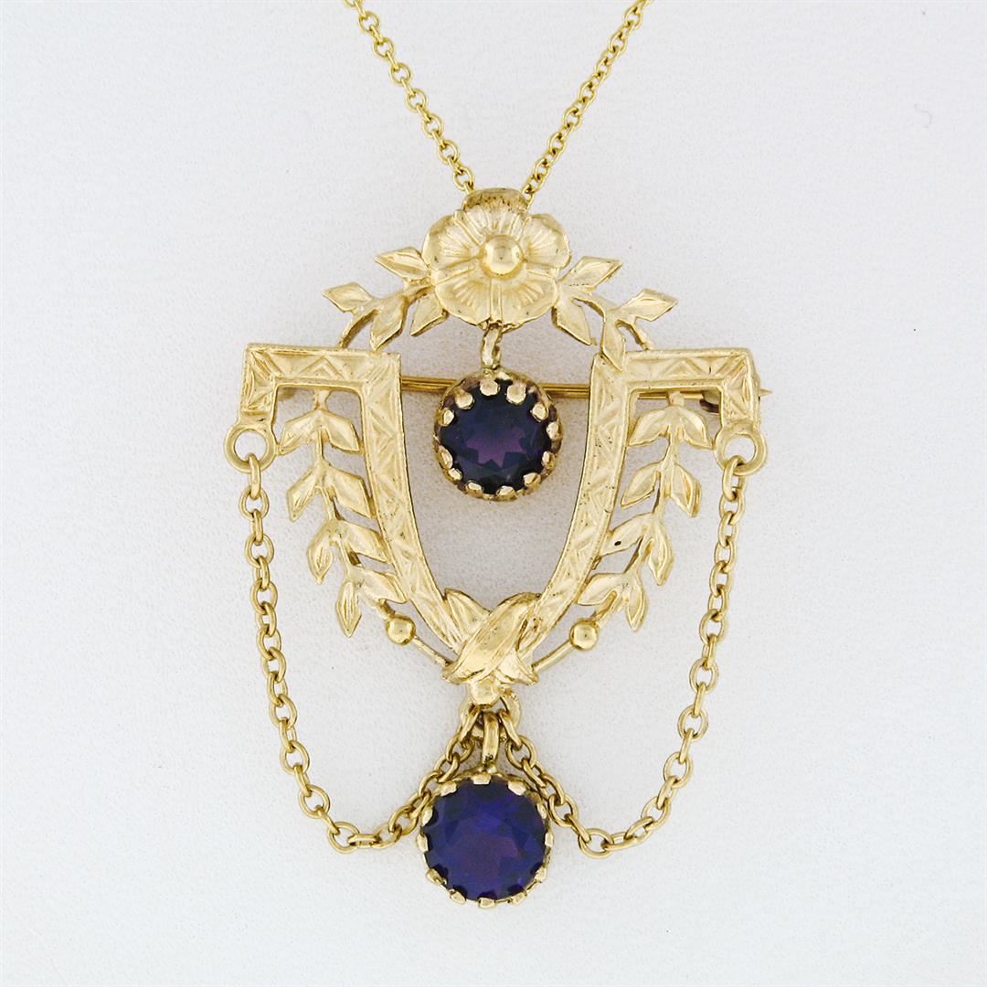 A vintage victorian revival solid 14k yellow gold pendant necklace. with 2 round cut natural amethyst (2.00ctw). The pendant weighs a total of 8.41 grams, measures 32.0x17.65mm including the bail, and 20 inch cable link chain.