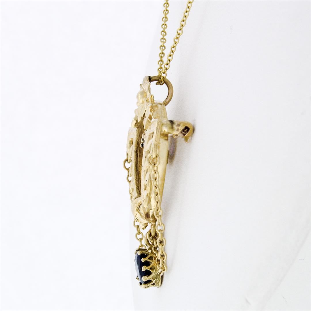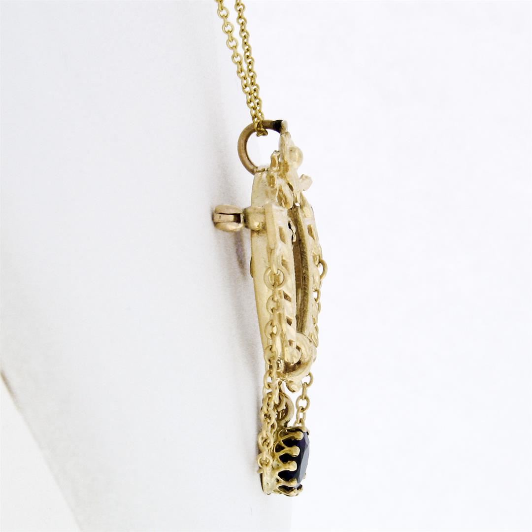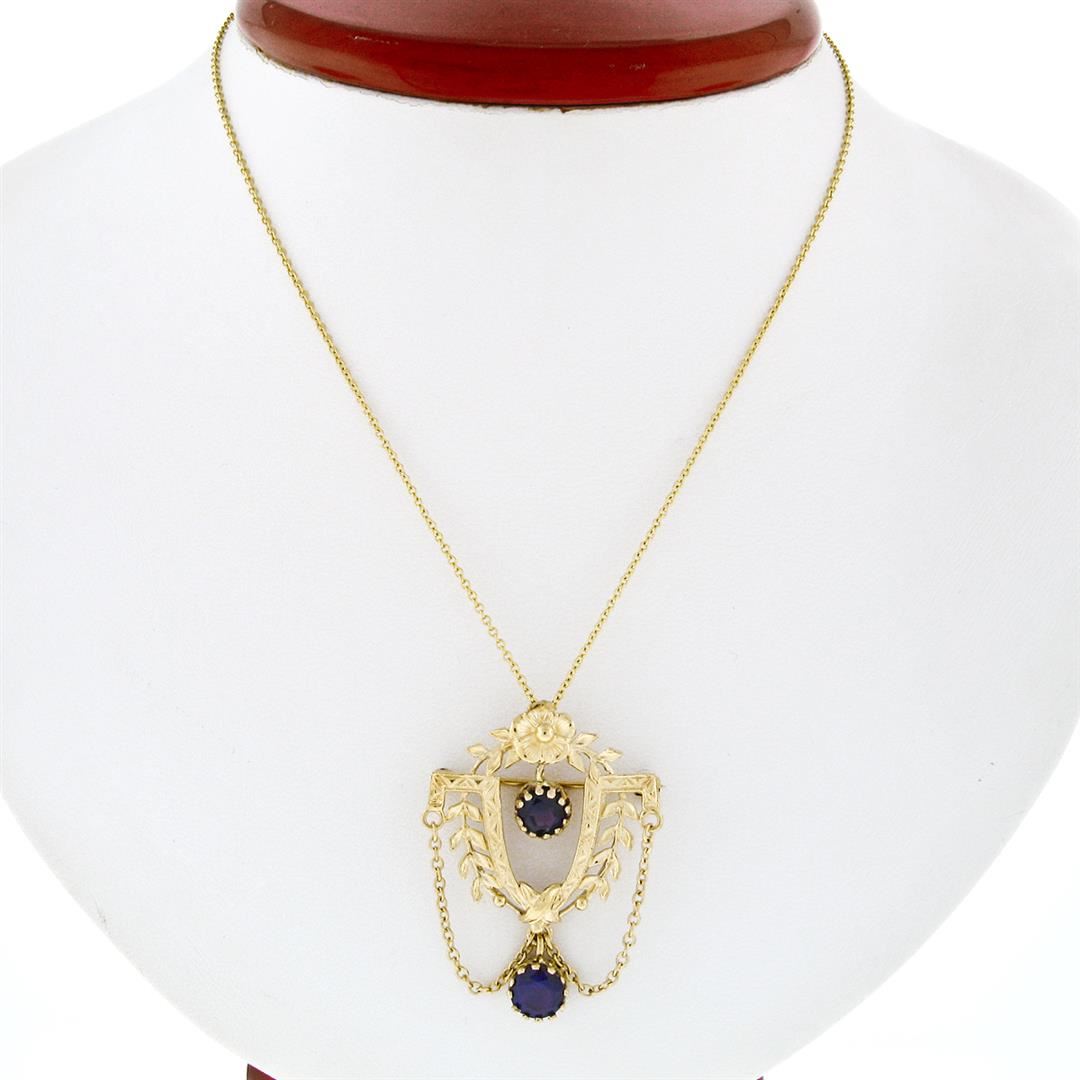 A vintage victorian revival solid 14k yellow gold pendant necklace. with 2 round cut natural amethyst (2.00ctw). The pendant weighs a total of 8.41 grams, measures 32.0x17.65mm including the bail, and 20 inch cable link chain.