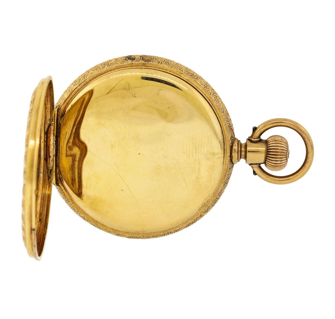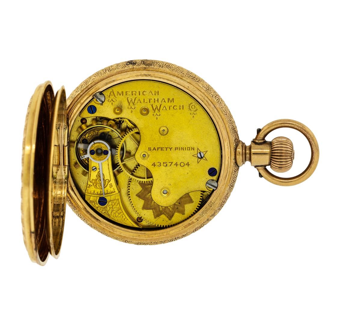 One Waltham vintage 10KT Rose Gold Pocketwatch. Movement: Waltham mechanical with manual winding, serial number 4357404. Case: Hunter, 10KT Rose Gold engraved on both sides, measures 40mm in diameter, case number 297295. Case signed "WALTHAM". There is a single cut diamond entrusted in the center of the case. Dial: White enamel with painted Roman numerals and blued steel hands. Seconds sub-dial is located at 6 o'clock. Condition: G-4 FINE, (good working order and good condition). Total Weight of Watch: 55.20gm.