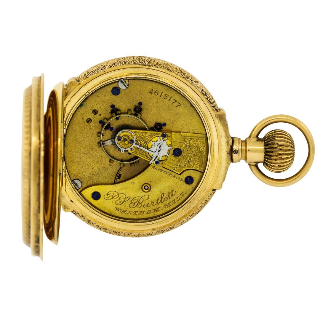 One Waltham vintage 14KT Yellow Gold Pocketwatch. Movement: Waltham mechanical with manual winding, serial number 4615177. Case: Hunter, 14KT Yellow Gold engraved on both sides, measures 54mm in diameter, case number 62050. Case signed "14KT". Dial: White enamel with Roman and Arabic numerals, outer minute track and blued steel "Spade". Seconds sub-dial is located at 6 o'clock. Condition: G-4 FINE, (good working order and good condition). Total Weight of Watch: 145.00gm.