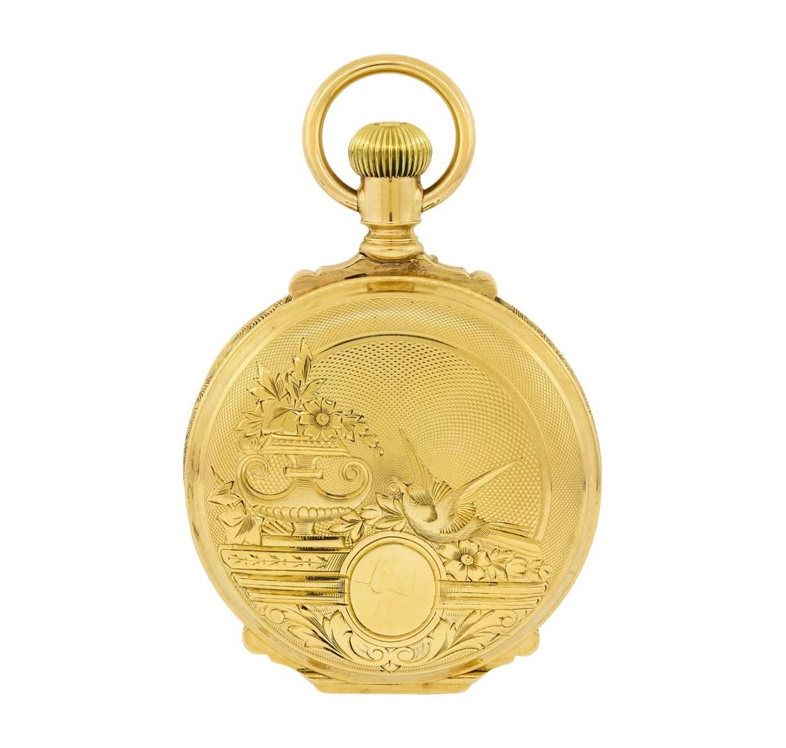 One Waltham vintage 14KT Yellow Gold Pocketwatch. Movement: Waltham mechanical with manual winding, serial number 6987095. Case: Hunter, 14KT Yellow Gold engraved on both sides, measures 48mm in diameter, case number 74996. Case signed "14KT". There are Arabic text engravings on the inner part of the case. Dial: White and blue enamel with painted Arabic numerals and "Louis XV" hands. Seconds sub-dial is located at 6 o'clock. Condition: G-4 FINE, (good working order and good condition). Total Weight of Watch: 108.00gm.