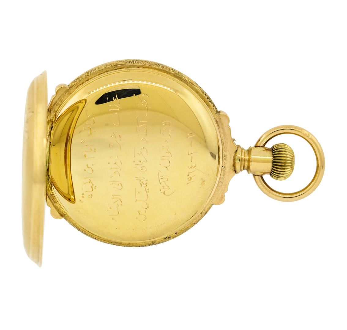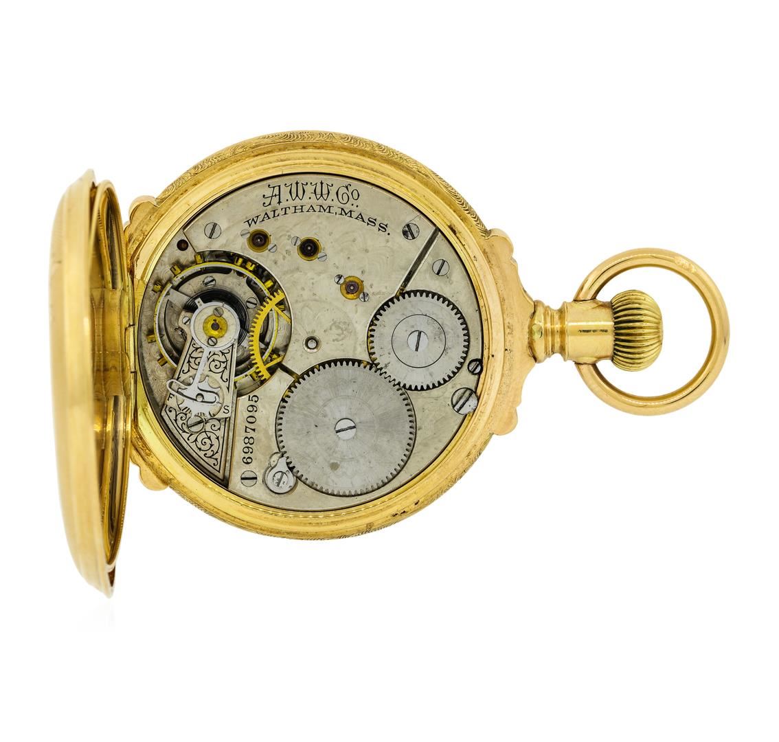 One Waltham vintage 14KT Yellow Gold Pocketwatch. Movement: Waltham mechanical with manual winding, serial number 6987095. Case: Hunter, 14KT Yellow Gold engraved on both sides, measures 48mm in diameter, case number 74996. Case signed "14KT". There are Arabic text engravings on the inner part of the case. Dial: White and blue enamel with painted Arabic numerals and "Louis XV" hands. Seconds sub-dial is located at 6 o'clock. Condition: G-4 FINE, (good working order and good condition). Total Weight of Watch: 108.00gm.
