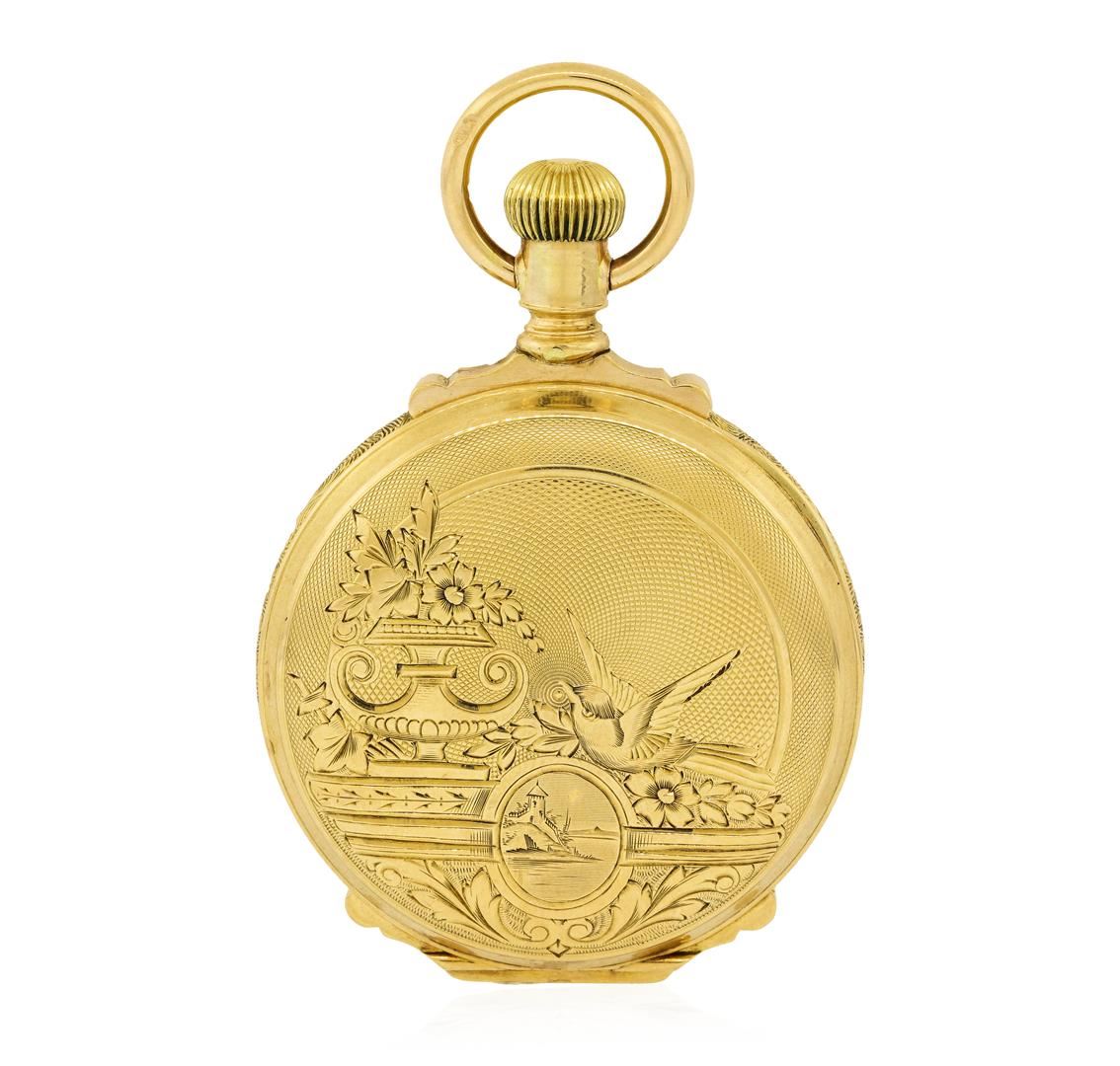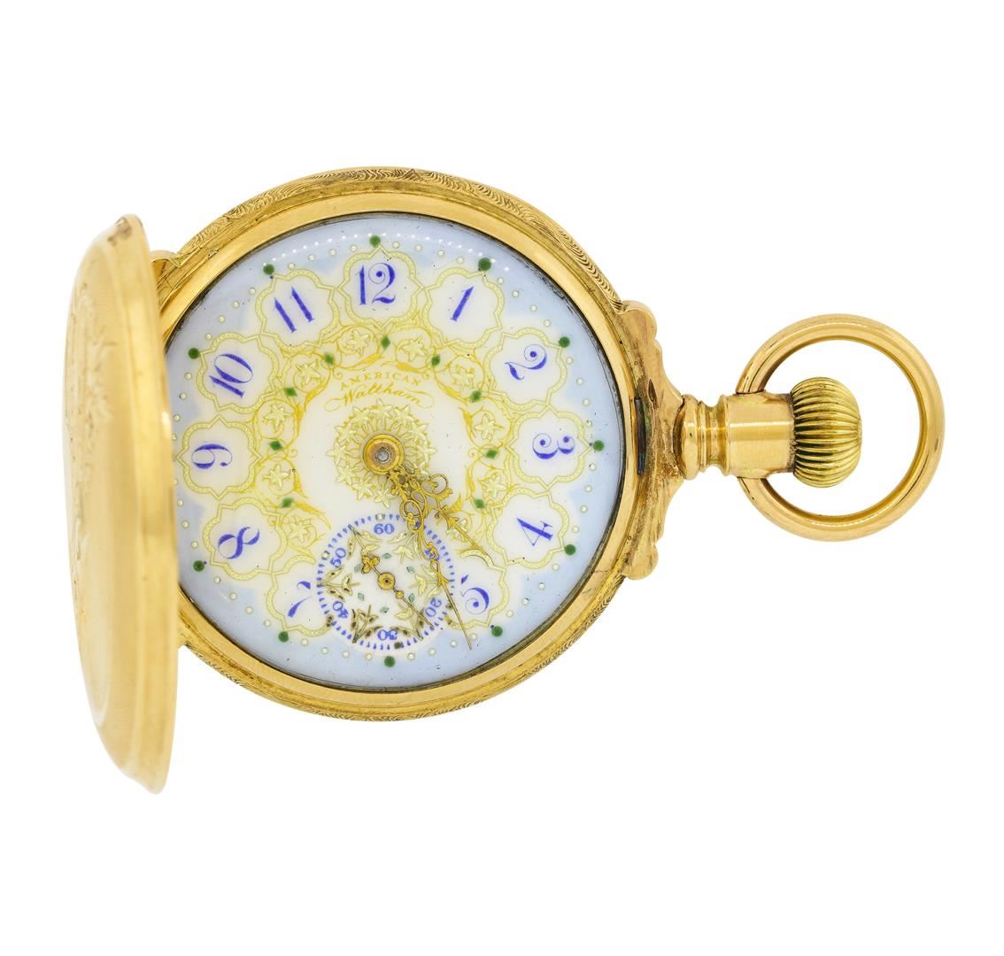 One Waltham vintage 14KT Yellow Gold Pocketwatch. Movement: Waltham mechanical with manual winding, serial number 6987095. Case: Hunter, 14KT Yellow Gold engraved on both sides, measures 48mm in diameter, case number 74996. Case signed "14KT". There are Arabic text engravings on the inner part of the case. Dial: White and blue enamel with painted Arabic numerals and "Louis XV" hands. Seconds sub-dial is located at 6 o'clock. Condition: G-4 FINE, (good working order and good condition). Total Weight of Watch: 108.00gm.