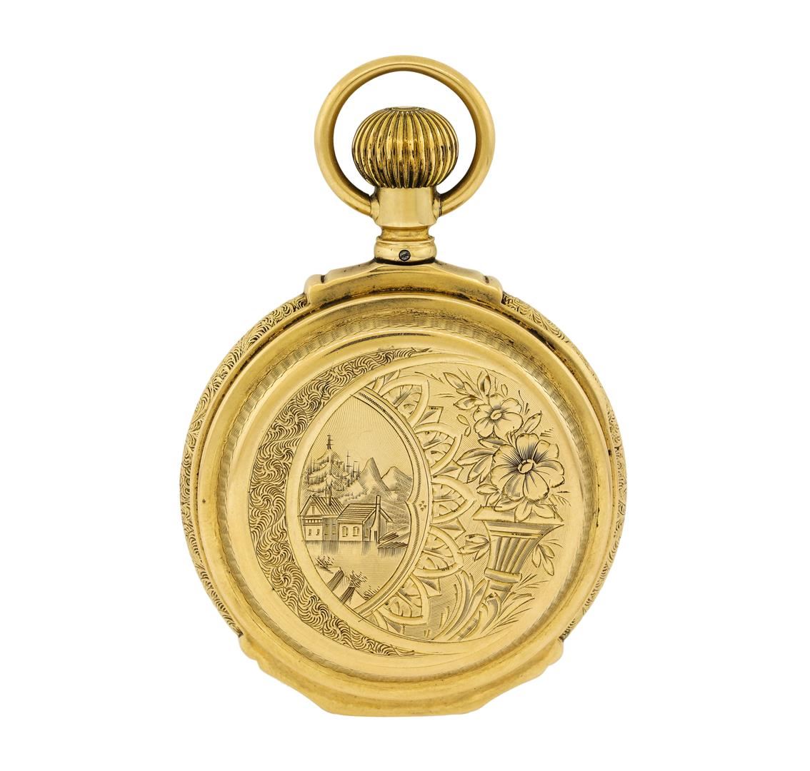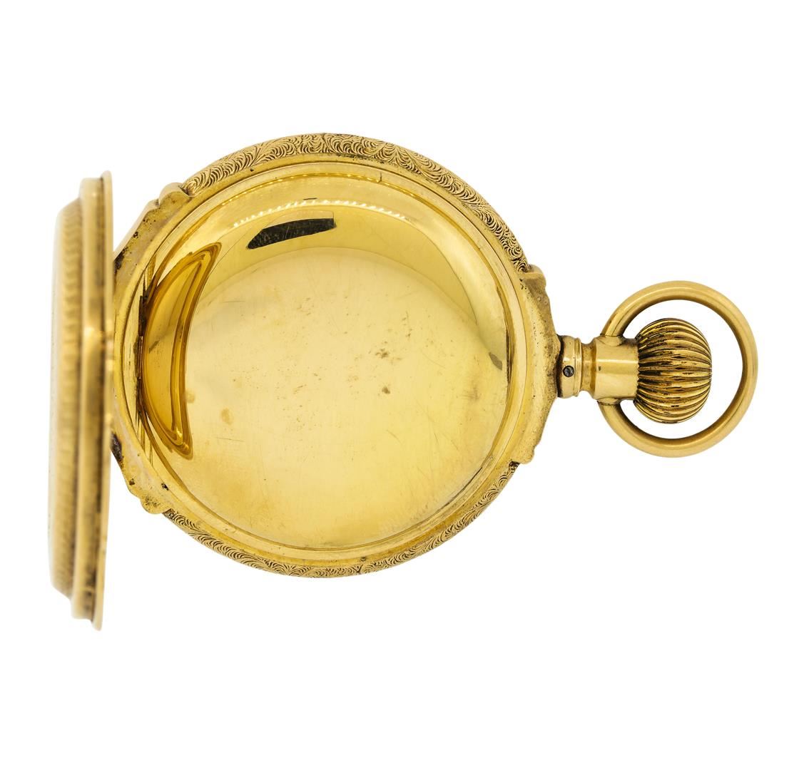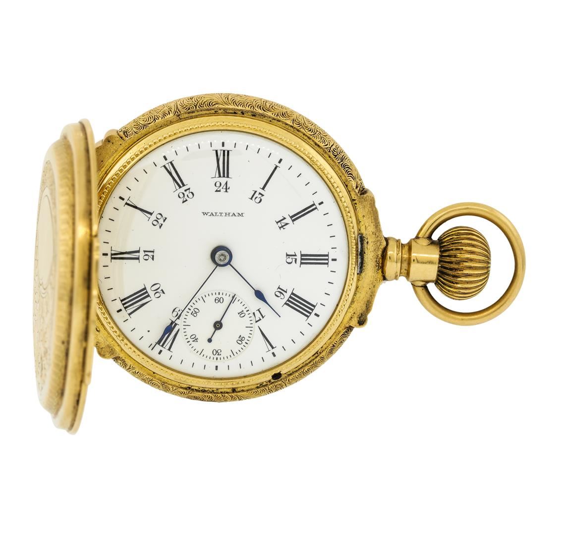 One Waltham vintage 14KT Yellow Gold Pocketwatch. Movement: Waltham mechanical with manual winding, serial number 4615177. Case: Hunter, 14KT Yellow Gold engraved on both sides, measures 54mm in diameter, case number 62050. Case signed "14KT". Dial: White enamel with Roman and Arabic numerals, outer minute track and blued steel "Spade". Seconds sub-dial is located at 6 o'clock. Condition: G-4 FINE, (good working order and good condition). Total Weight of Watch: 145.00gm.