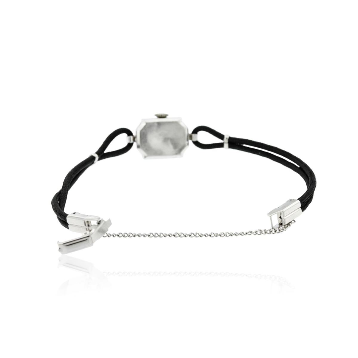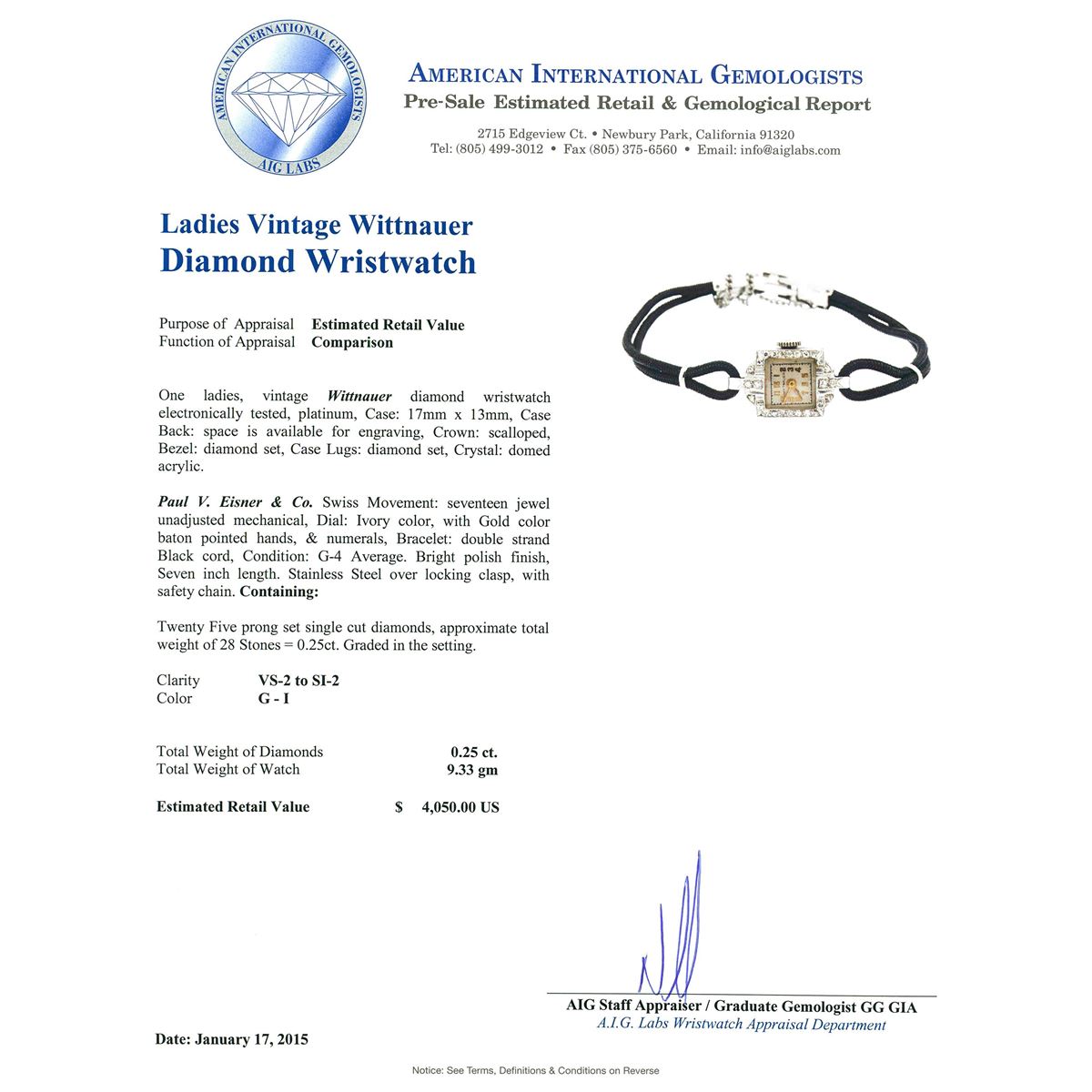 One ladies, vintage Wittnauer diamond wristwatch electronically tested, platinum, Case: 17mm x 13mm, Case Back: space is available for engraving, Crown: scalloped, Bezel: diamond set, Case Lugs: diamond set, Crystal: domed acrylic. Paul V. Eisner & Co. Swiss Movement: seventeen jewel unadjusted mechanical, Dial: Ivory color, with Gold color baton pointed hands, & numerals, Bracelet: double strand Black cord, Condition: G-4 Average. Bright polish finish, Seven inch length. Stainless Steel over locking clasp, with safety chain. Containing: Twenty Five prong set single cut diamonds, approximate. Total Weight of 28 Stones = 0.25ct. Graded in the setting. Clarity: VS-2 to SI-2. Color: G - I. Total Weight of Diamonds 0.25ct. Total Weight of Watch 9.33 grams. AIG Appraised at $4,050.00.