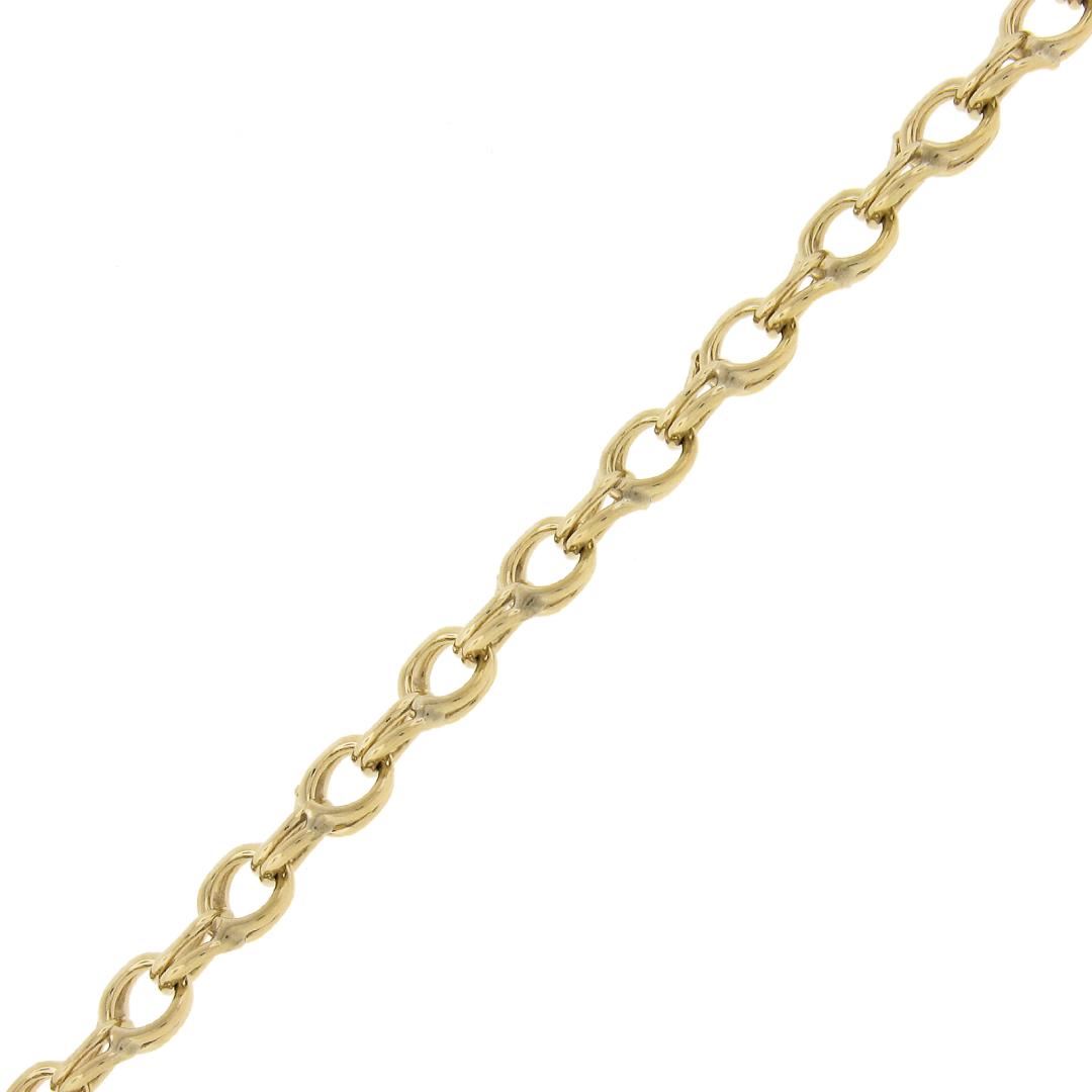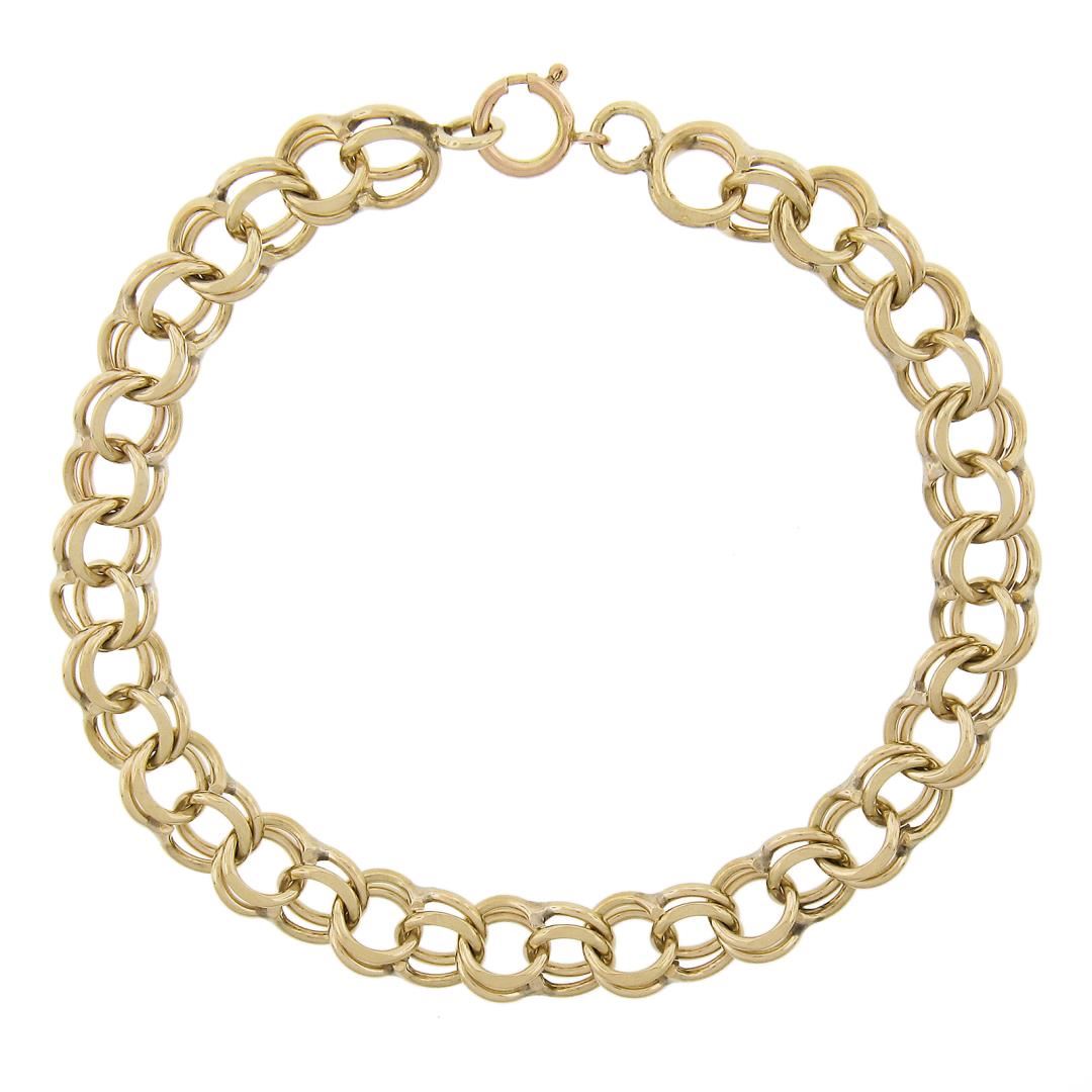 A vintage 14k yellow gold charm link bracelet. It weighs a total of 12.95 grams, measures 7.3mm wide, and measures 7.25 inches in length.