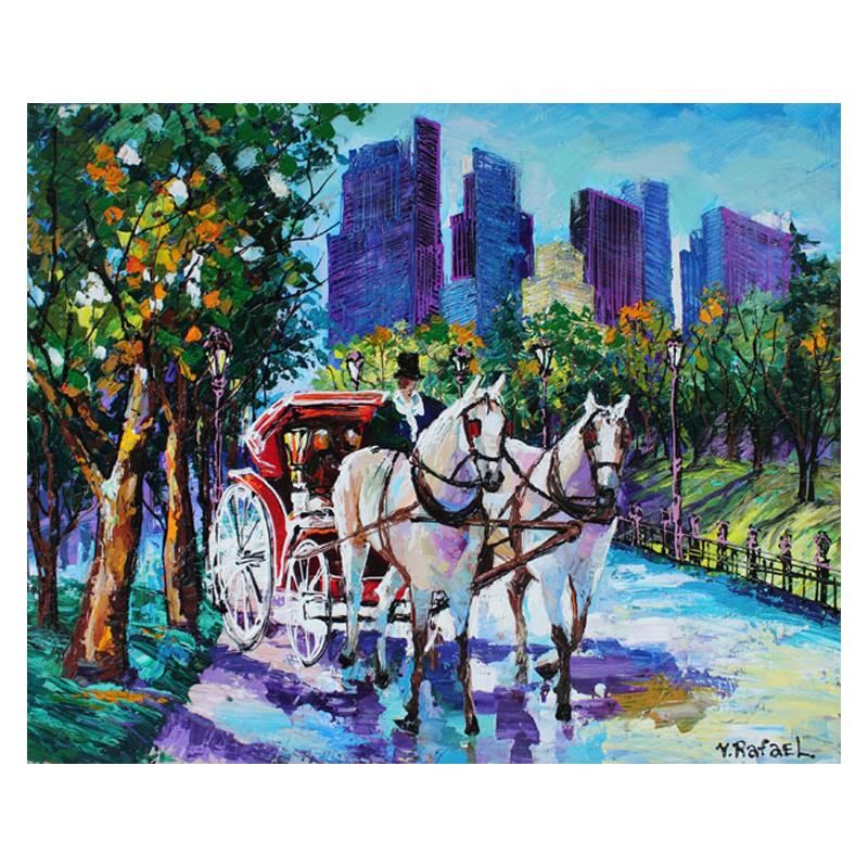 "Visit to the City" is an original painting, acrylic on stretched canvas, by Yana Rafael. Hand signed by the artist, this piece is accompanied by certificate of authenticity and measures approximately 30" x 40".