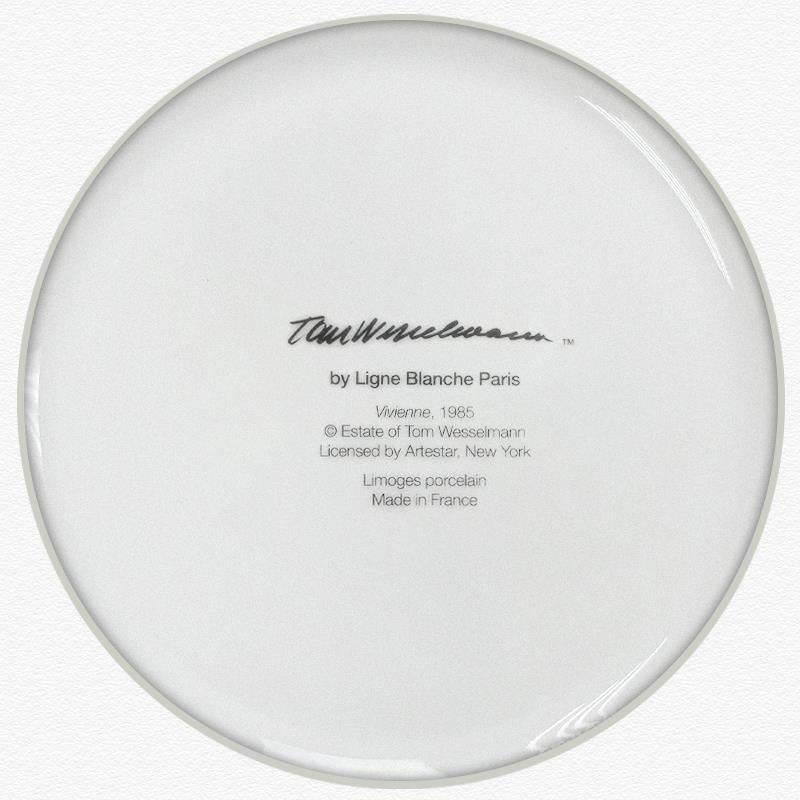 "Vivienne (1985)" is a Limoges porcelain plate bearing the plate signature inverso of Tom Wesselmann (1931-2004). This plate is custom framed and floated on linen. Measures approx. 13.5" x 13.5" (frame), 8.5" (plate diameter).