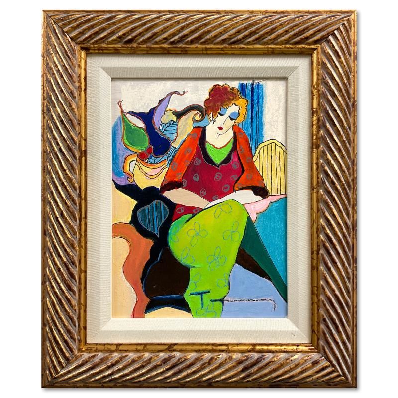 "Waiting" is a one-of-a-kind mixed media over paint on wood by Itzchak Tarkay (1935-2012), hand signed by the artist. This piece comes custom framed. Includes Letter of Authenticity. Measures approx. 17" x 14" (frame), 11" x 8" (image).