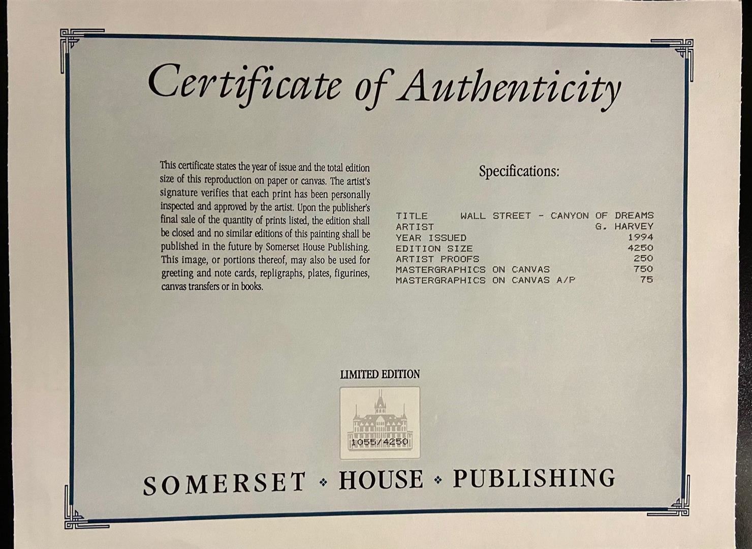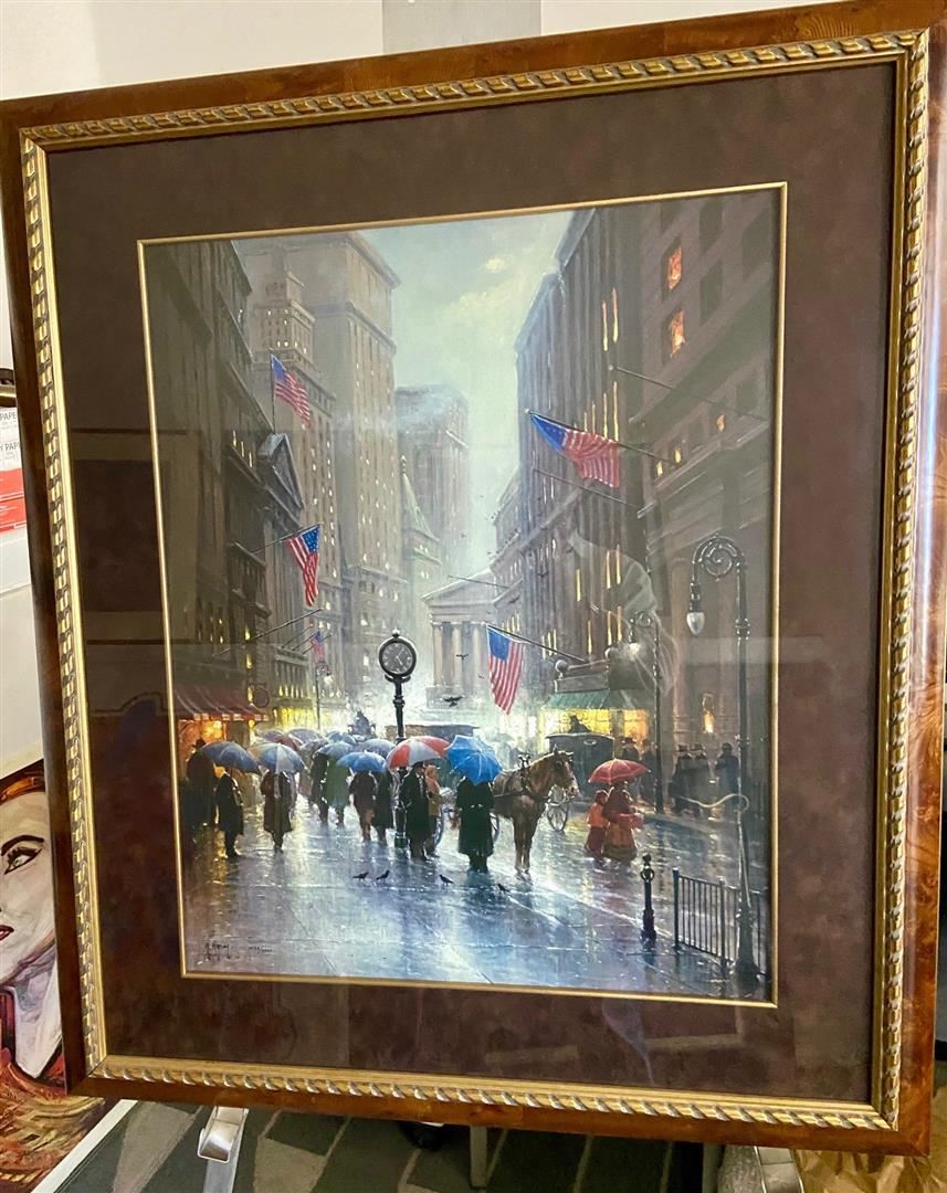 A framed 1994 lithograph by G. Harvey, of "Wall Street" near the turn of the Century. #1055/4250 Framed 39 x 33" With COA.