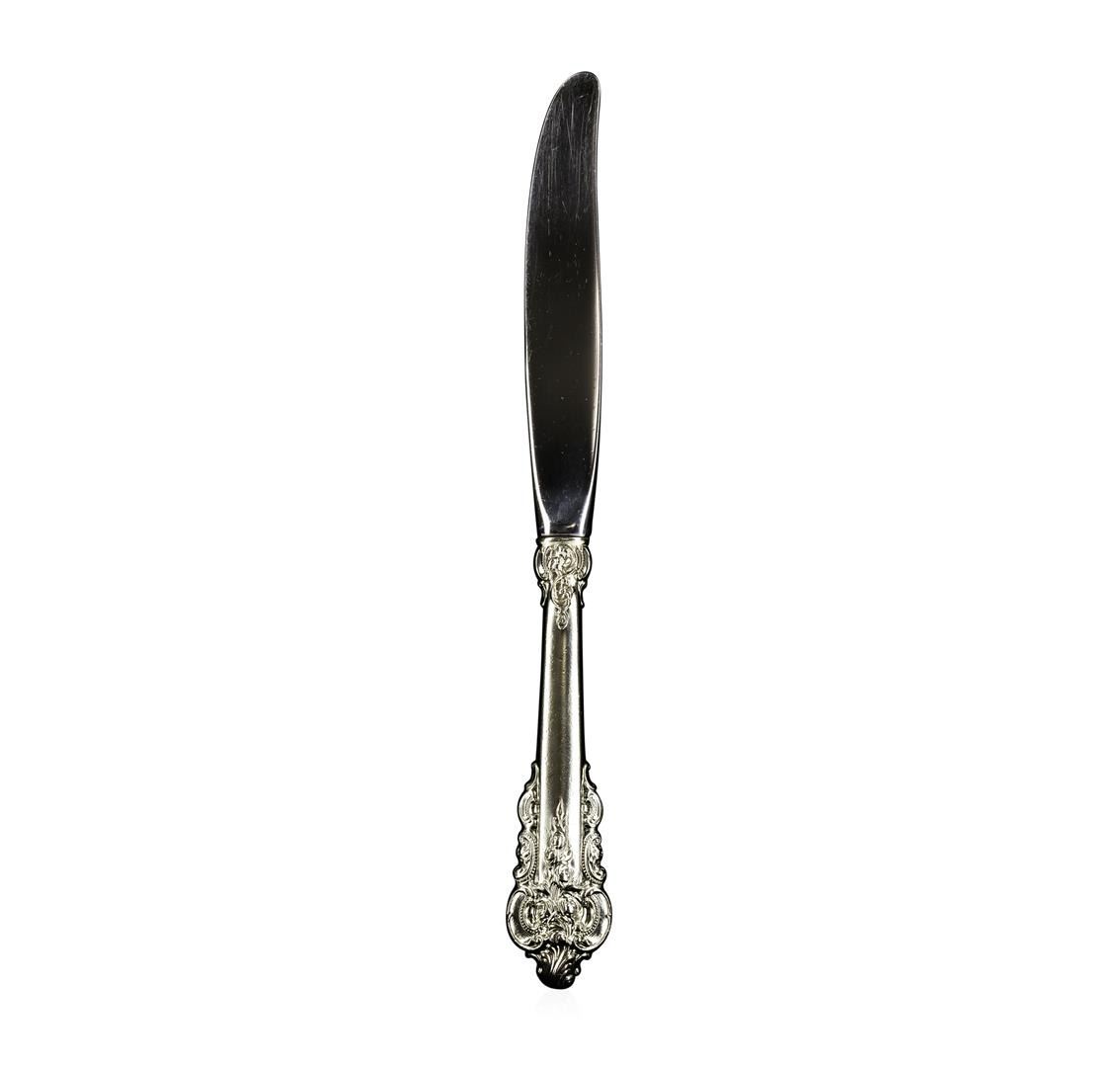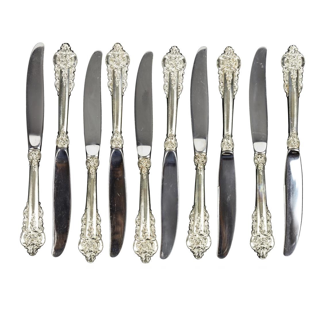 This listing is for a vintage set of Wallace Grande Baroque sterling silver knives, set of 10. They measure 9" long. They are in excellent vintage condition. There are no monograms on any of the knives. They are hallow handles and modern. List price for a new grand baroque knife is $210/ea.