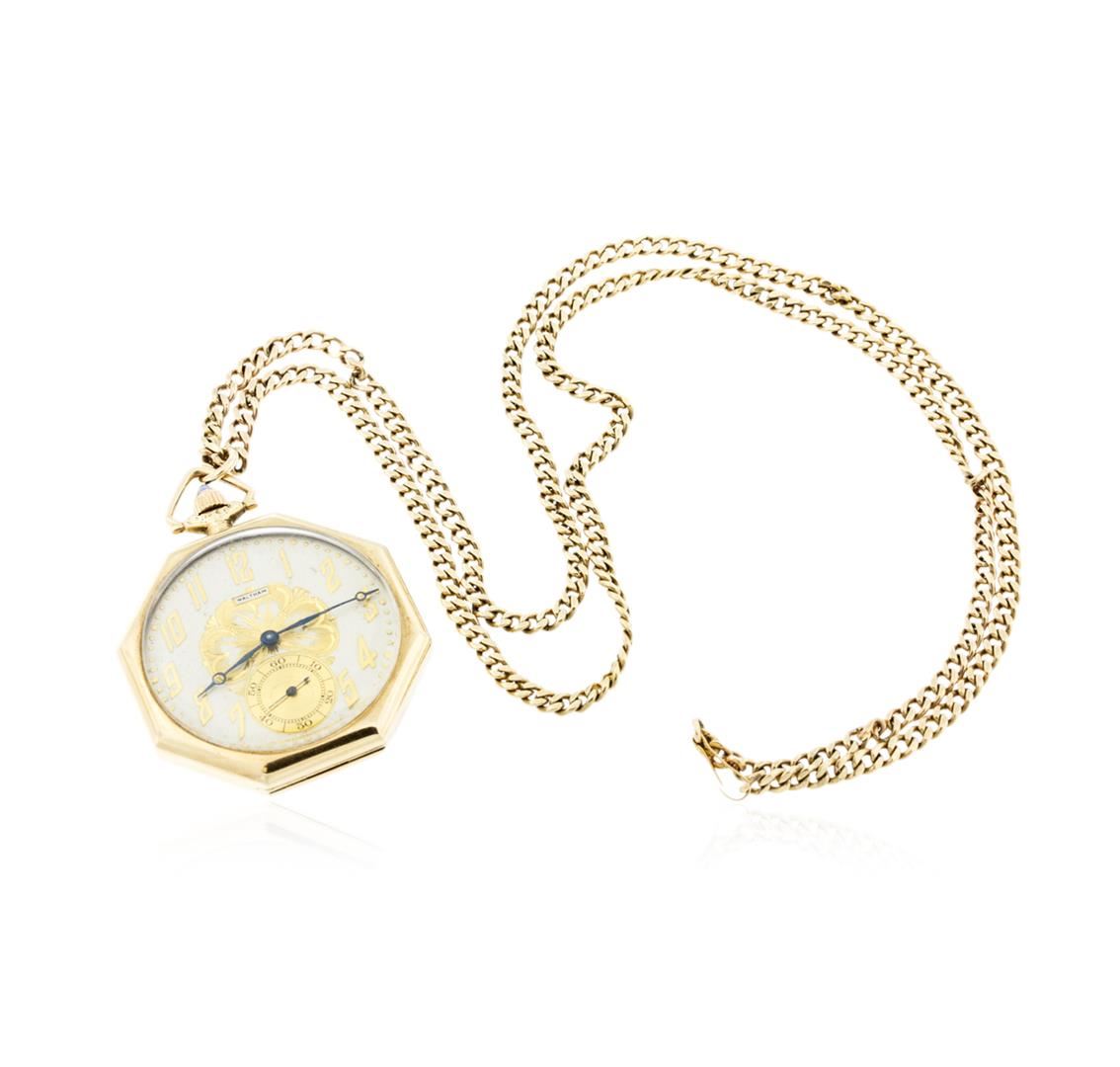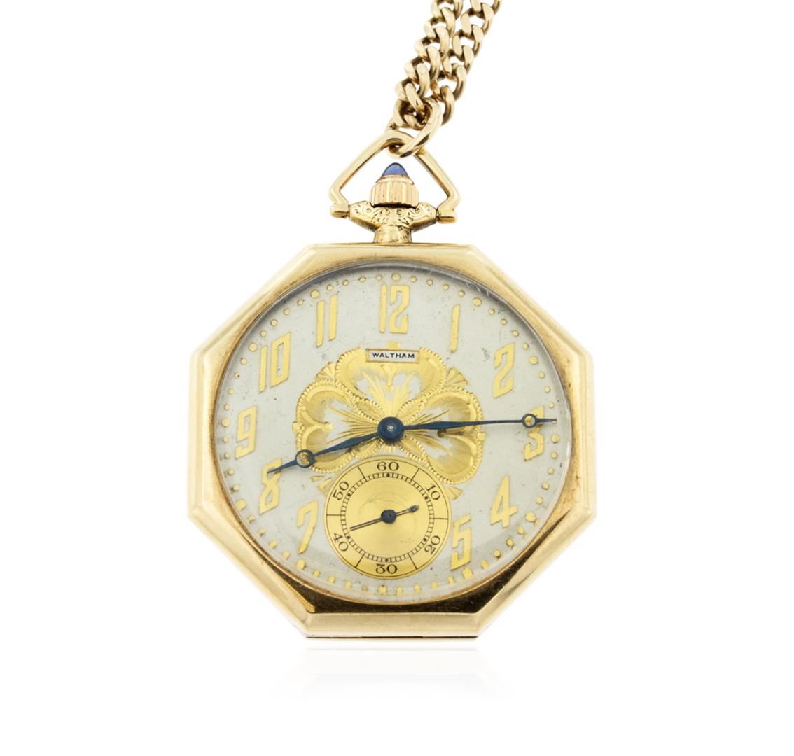 One, Waltham open face pocket watch electronically tested 14KT yellow gold, Case: 44mm octagonal, the obverse side is available for engraving, Crown: scalloped, set with a Blue cabochon crystal, Bezel: polished, Crystal: acrylic. Movement: Waltham U.S.A. seventeen jewel mechanical stem wind, Waltham signed Dial: Ivory color, with pointed hands, numerals, and a minute division track, the dial features a gold color three leaf clover in the center, Subsidiary Seconds Sub Dial: at the 6 o'clock position, Condition: G-4 Average. The pocket watch is attached to a 14KT yellow gold twenty six inch length, three millimeter wide flat link chain. Total Weight of Watch 57.00 grams. Total Weight of Chain 29.00 grams. AIG Appraised at $3,880.00.