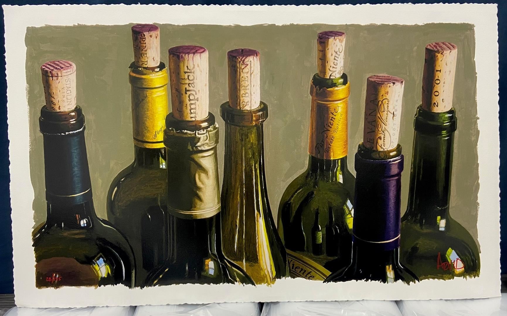 A beautful colorful study of 7 of Thomas Arvid's favorite wines . This giclee is 21x34" with image 18x31", a previously framed limited edition 28/125 on deckle-edged paper,signed & numbered . Mounted on acid free foamboard, this must be shipped flat-packed.