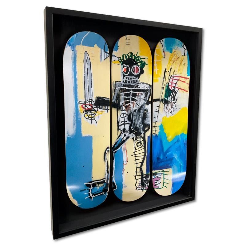 "Warrior (1982)" is a skateboard triptych by Jean-Michel Basquiat (1960-1988), bearing the plate signature of the artist inverso. This triptych comes custom framed. Includes Letter of Authenticity. Measures approx. 30" x 37" x 3" (frame), 24" x 32" (skateboards).