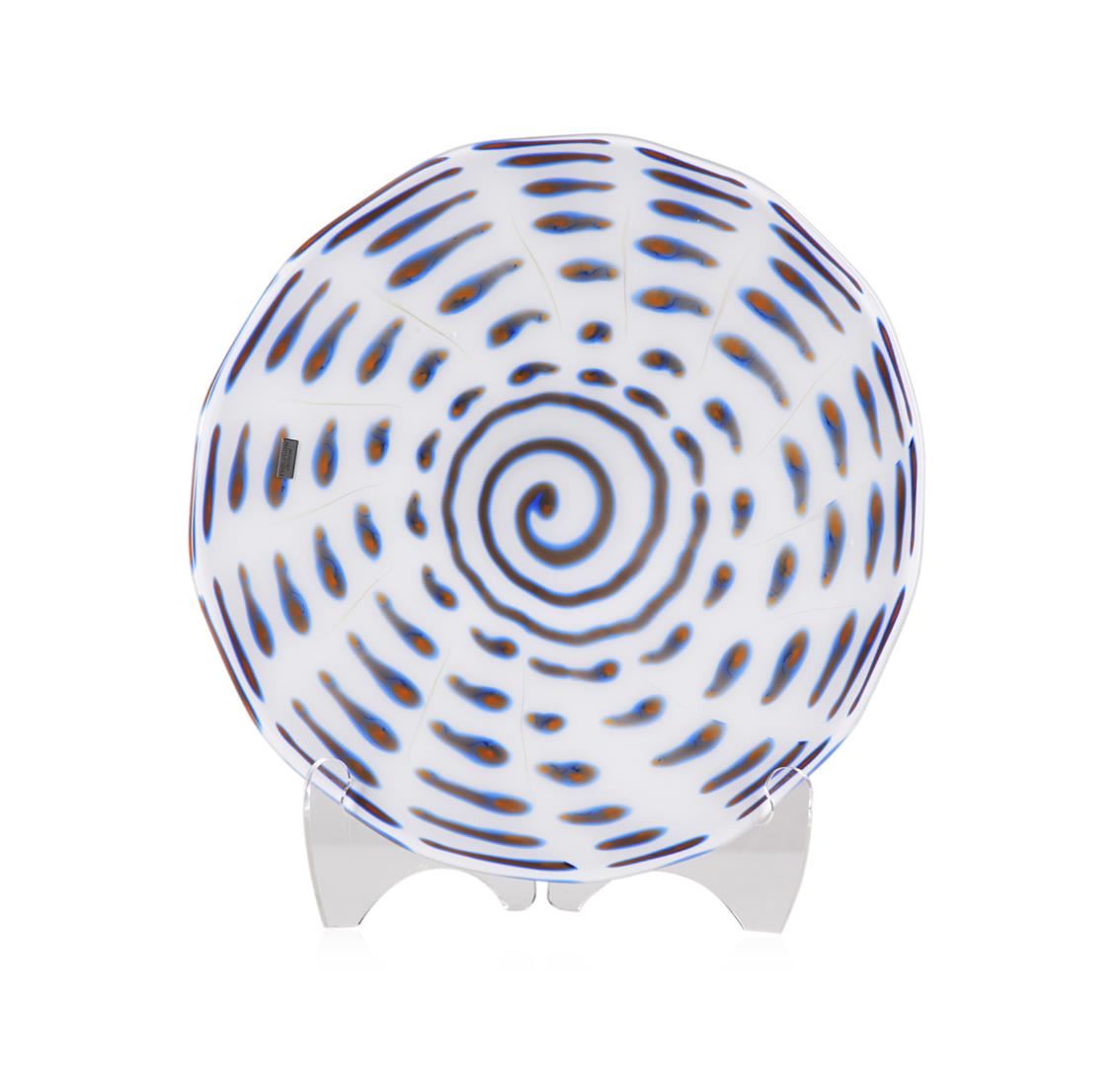This large, heavy weight centerpiece tray, from the Menagerie Collection, is a magnificent hand made art glass and will go in any room with any décor. It is white, vibrant blue and touch of orange. Striking. Mfg No. 161583 Trinidad Menagerie Centerpiece. Art Glass. Hand Wash. Imported - Hand made in Poland, 1.5" H x 19.5" W. This Stylish glass tray from the Evolution Trinidad collection is inspired by the exotic species that roam the world's most striking landscapes. Features a free flowing interpretation of the coat of the Ocelot.