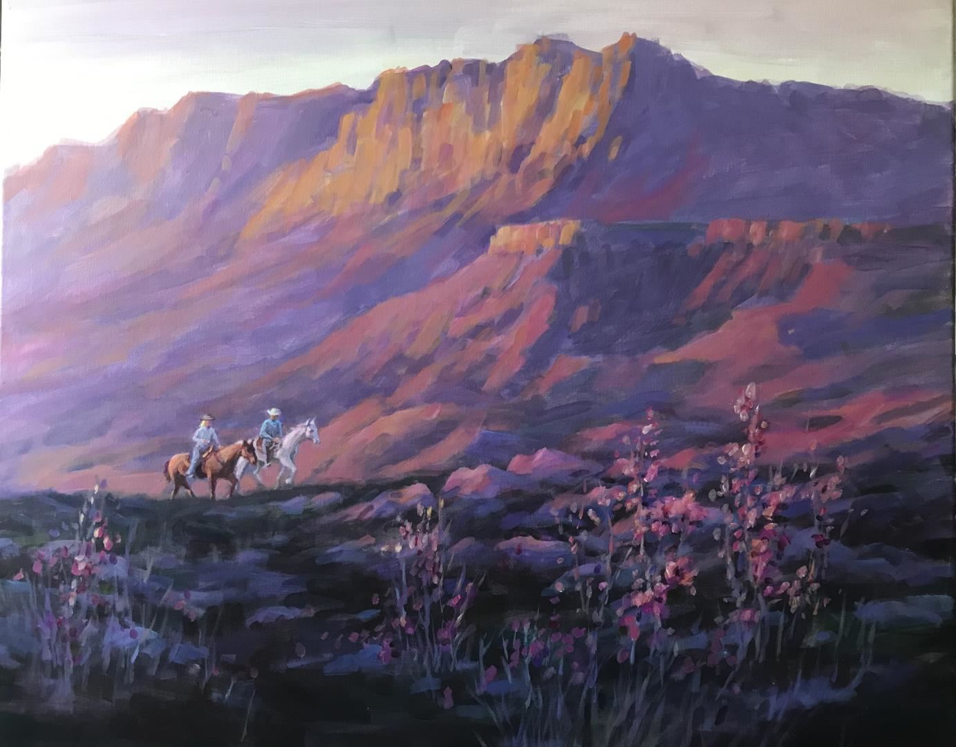 Two riders take the long road home. An original 24X30" acrylic on stretched canvas by Richard Ho. w/COA.