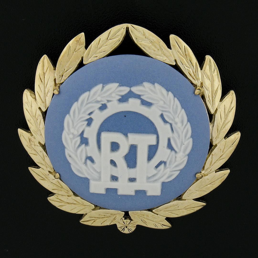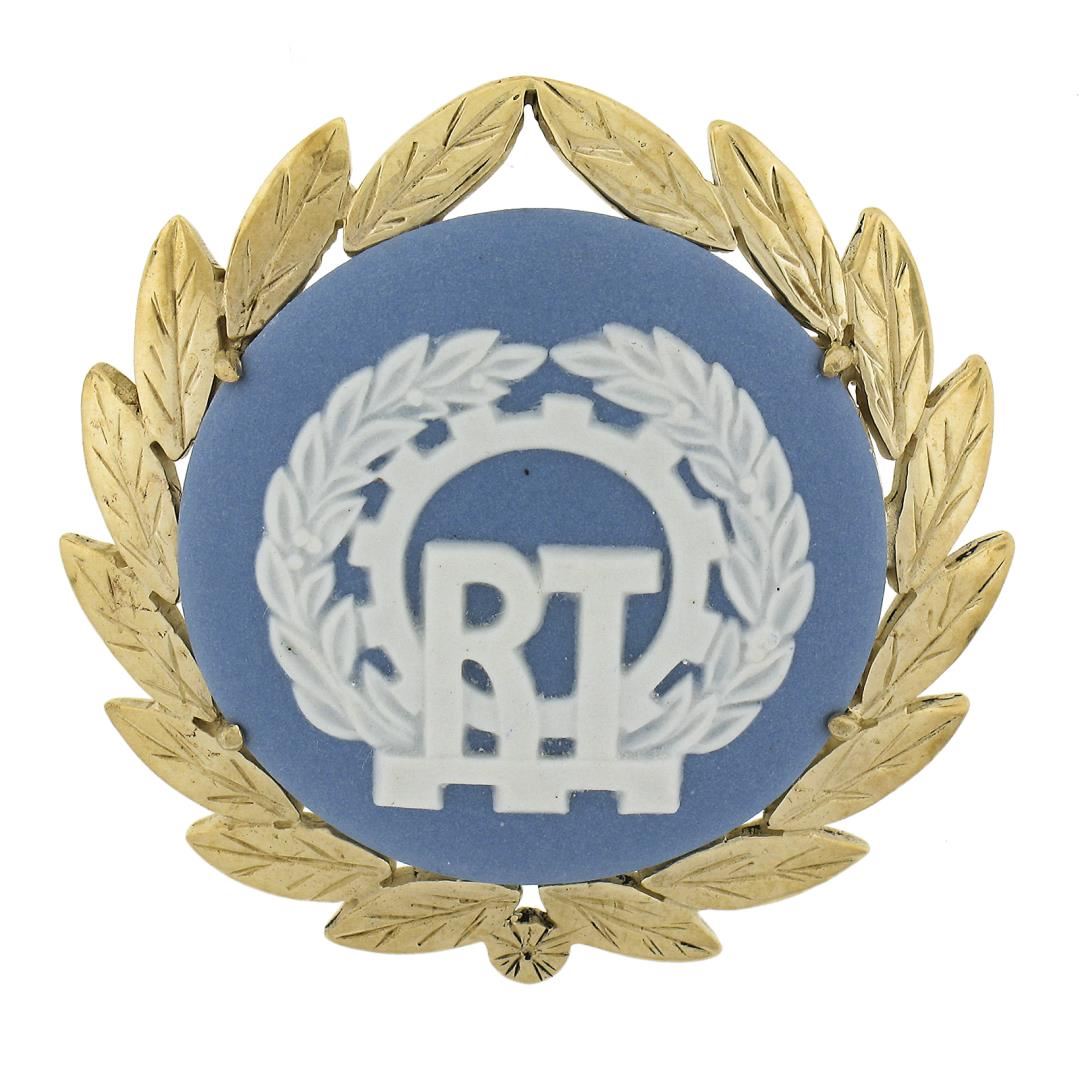 A solid 10k yellow gold brooch pendant by Wedgwood Laurel, with 1 round cut jasper (28.7mm). Measures 39.2mm and weighs a total of 10.71 grams, and inside bail dimensions 3.5x2.2mm.