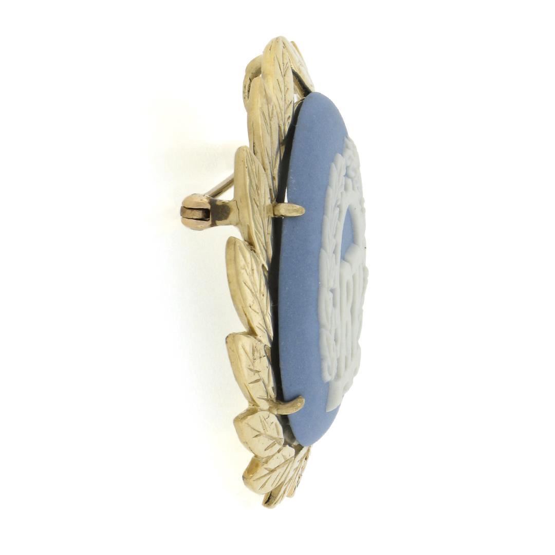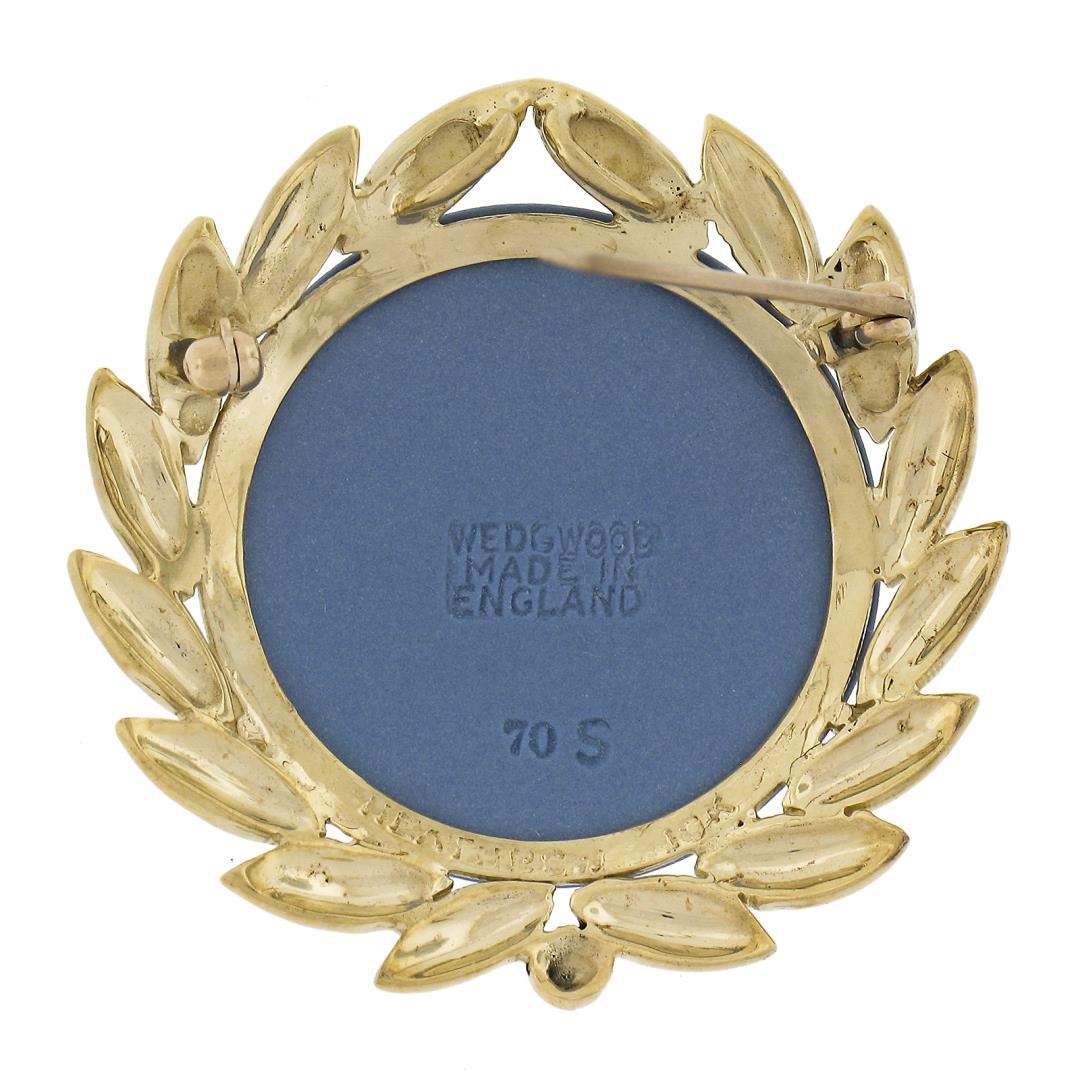 A solid 10k yellow gold brooch pendant by Wedgwood Laurel, with 1 round cut jasper (28.7mm). Measures 39.2mm and weighs a total of 10.71 grams, and inside bail dimensions 3.5x2.2mm.