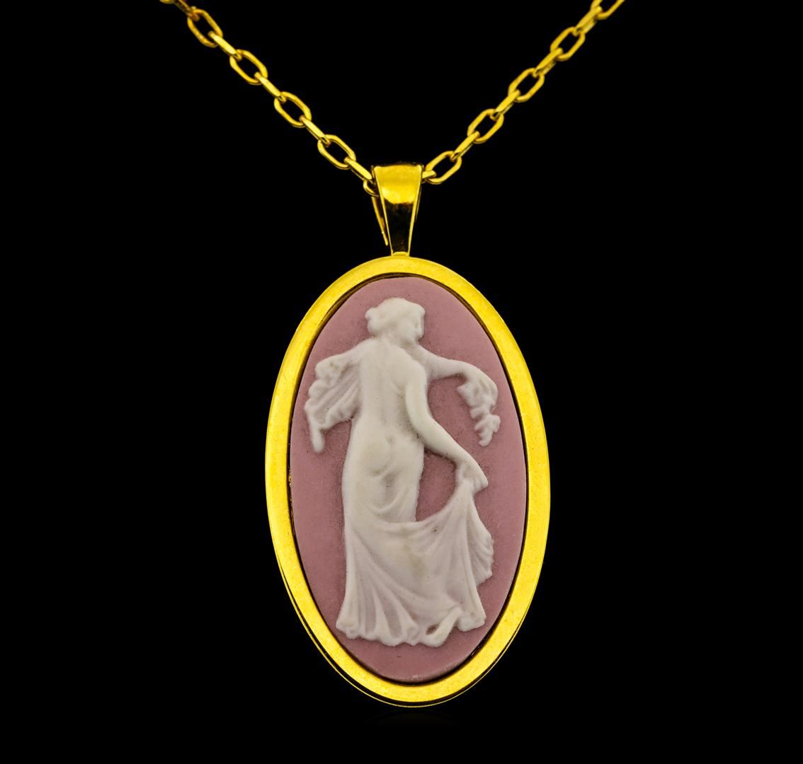 Wedgwood Women's Classic Muse Pendant New with Tags. This stunning Pendant features a white bas-relief rendering of the Floral Girl. It's set against the splendor of pink jasper. Chain length is 18". Yellow Gold Plated. Oval Shape - measures .75"x 1.25". Comes in the original Wedgwood box. Valued between $150-$200