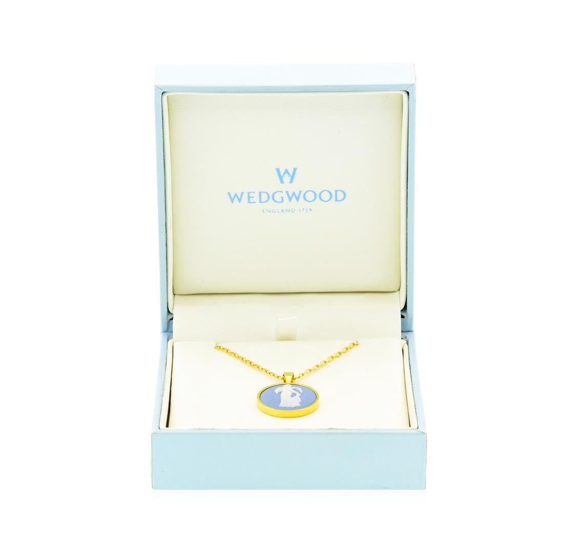 Wedgwood Women's Classic Muse Pendant New with Tags. This stunning Pendant features a white bas-relief rendering of the Floral Girl. It's set against the splendor of Saxon blue jasper. Chain length is 18". Yellow Gold Plated. Round Shape - measures 1". Comes in the original Wedgwood box. Valued between $150-$200