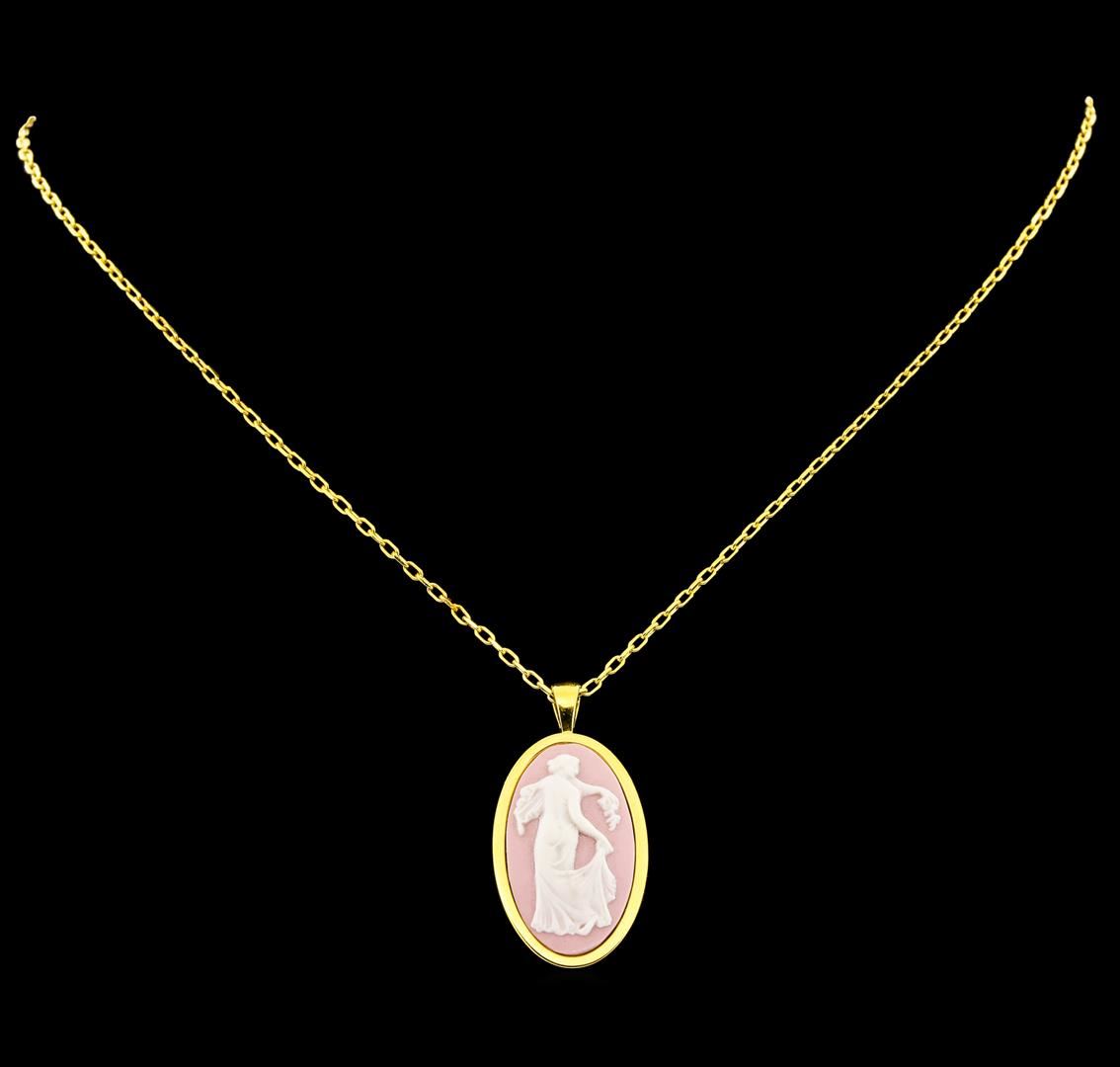 Wedgwood Women's Classic Muse Pendant New with Tags. This stunning Pendant features a white bas-relief rendering of the Floral Girl. It's set against the splendor of pink jasper. Chain length is 18". Yellow Gold Plated. Oval Shape - measures .75"x 1.25". Comes in the original Wedgwood box. Valued between $150-$200