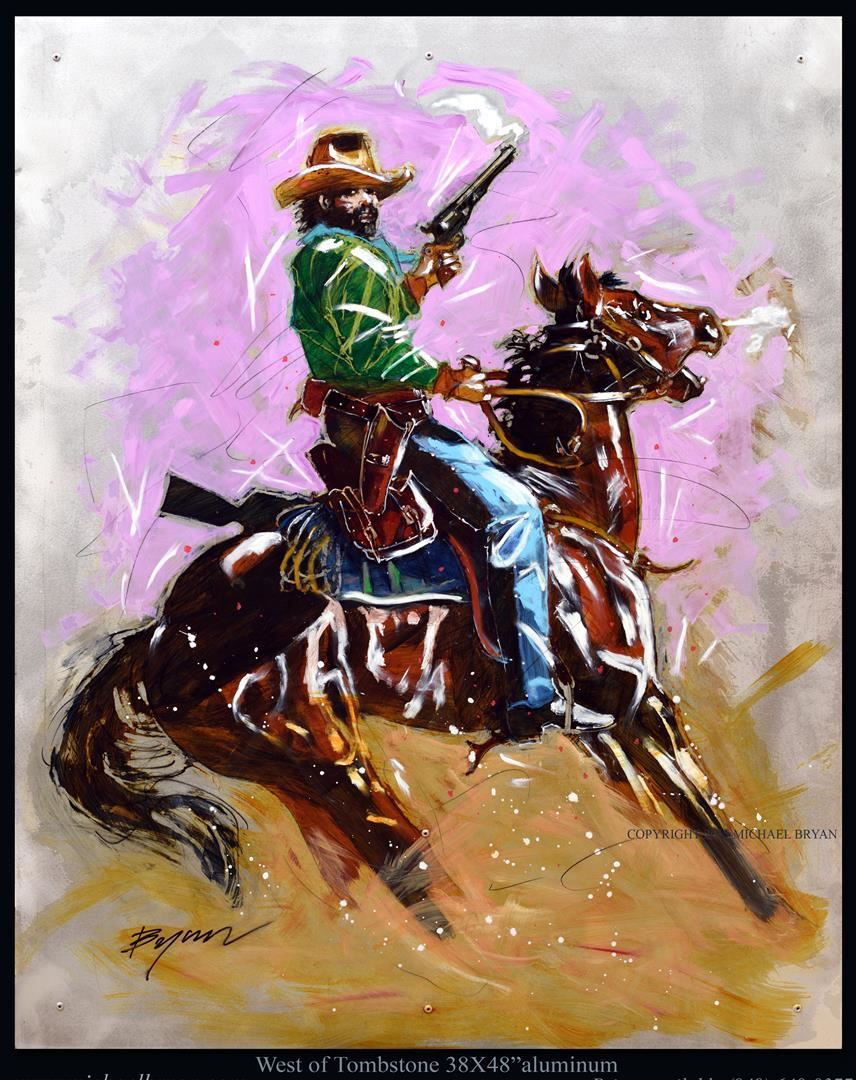 The wild west was conquered and settled by strong brave men & women that tamed its fury and forged it into an American dream. This tribute by Michael Bryan is a 40x32 " handworked giclee on canvas, a Unique 1/1 work of Western Art.