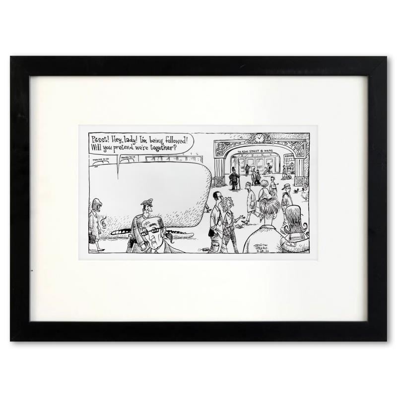 Enter a surreal and satirical world of twisted imagination and award winning creativity. "Whale Tail" is an original pen & ink drawing on paper by Dan Piraro, creator of the critically acclaimed and award winning comic strip, Bizarro. This piece is hand signed, comes custom framed and includes a letter of authenticity. Measures approximately 14" x 21" (frame), 7" x 13" (image). This item requires special handling and may have a longer than usual turnaround.
