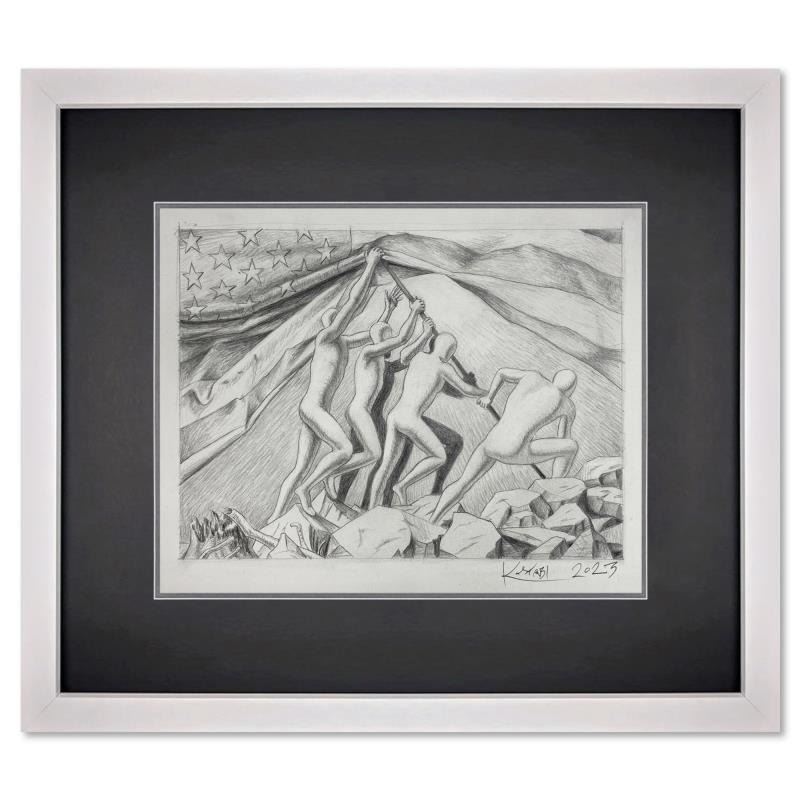 "Whatever it Takes - New York" is an original drawing on paper by Mark Kostabi, hand signed by the artist. This piece comes custom framed. Includes Certificate of Authenticity. Measures approx. 14" x 15.5" (frame), 8" x 9.5" (image).