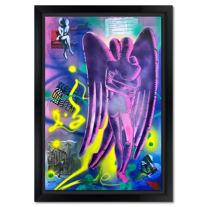 "Whispers from the Past" is an original mixed media painting on paper by Mark Kostabi, hand signed by the artist. The piece comes framed. Includes Certificate of Authenticity. Measures approx. 36" x 50" (frame), 30" x 44" (image).