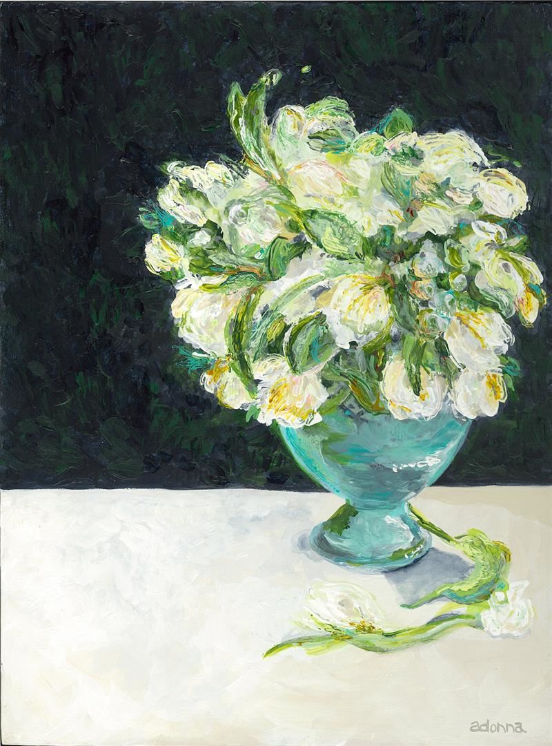 An original Acrylic on wood panel by Adonna. 9x 12. A classic still life that invites the viewer to examine the texture and detailed strokes of white tulips