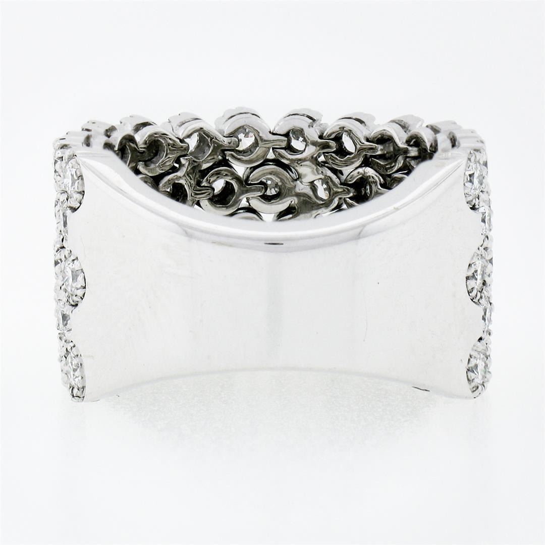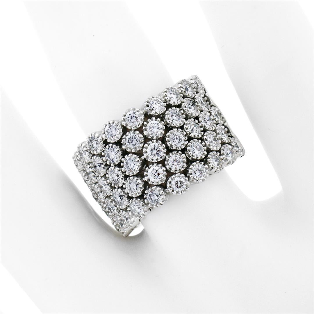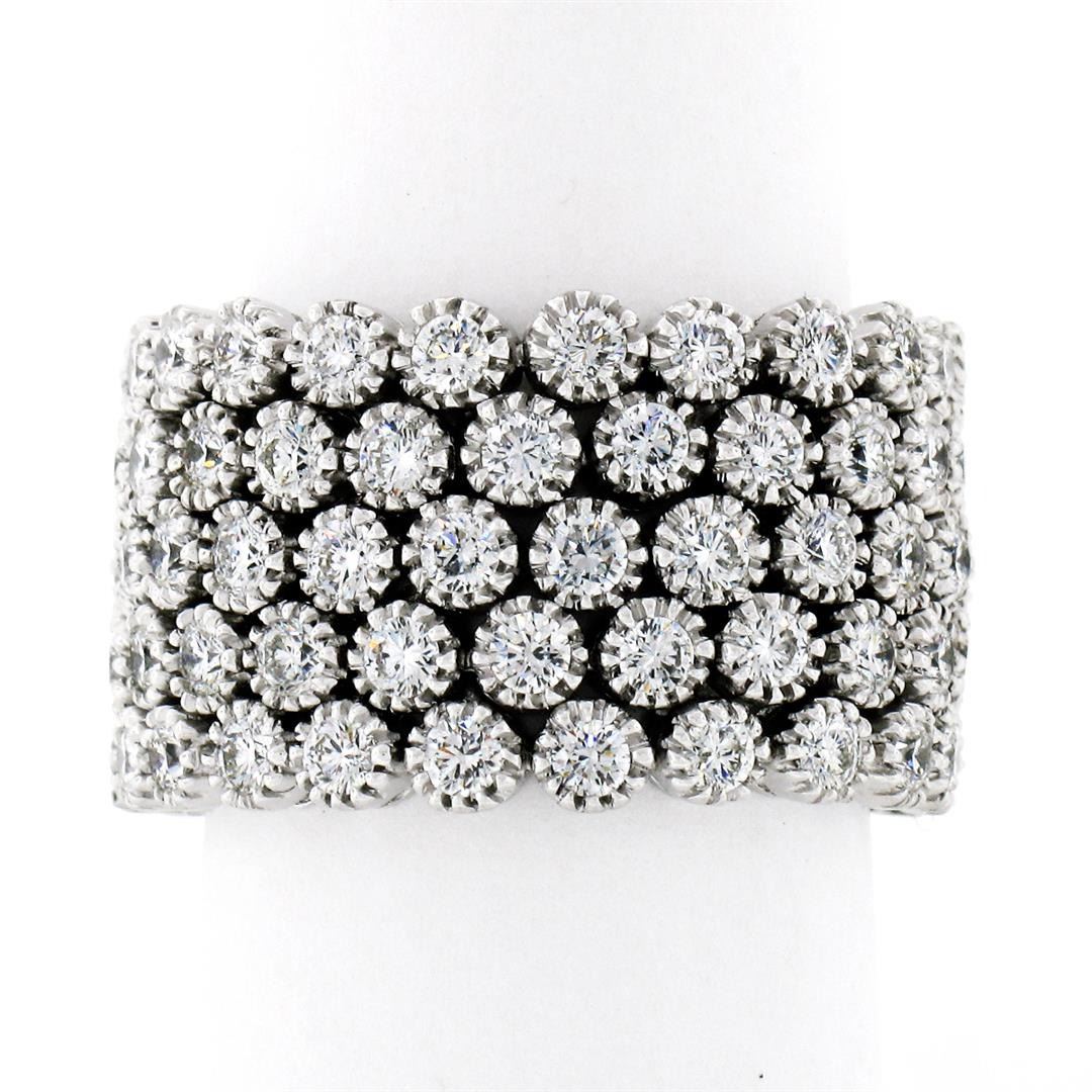 An estate solid 18k white gold wide band ring, with 68 round brilliant cut natural diamonds (F/G- VS1/VS2 ; 2.72ctw). The ring is size 7.0, weighs a total of 14.62 grams, and measures 13.50mm wide.