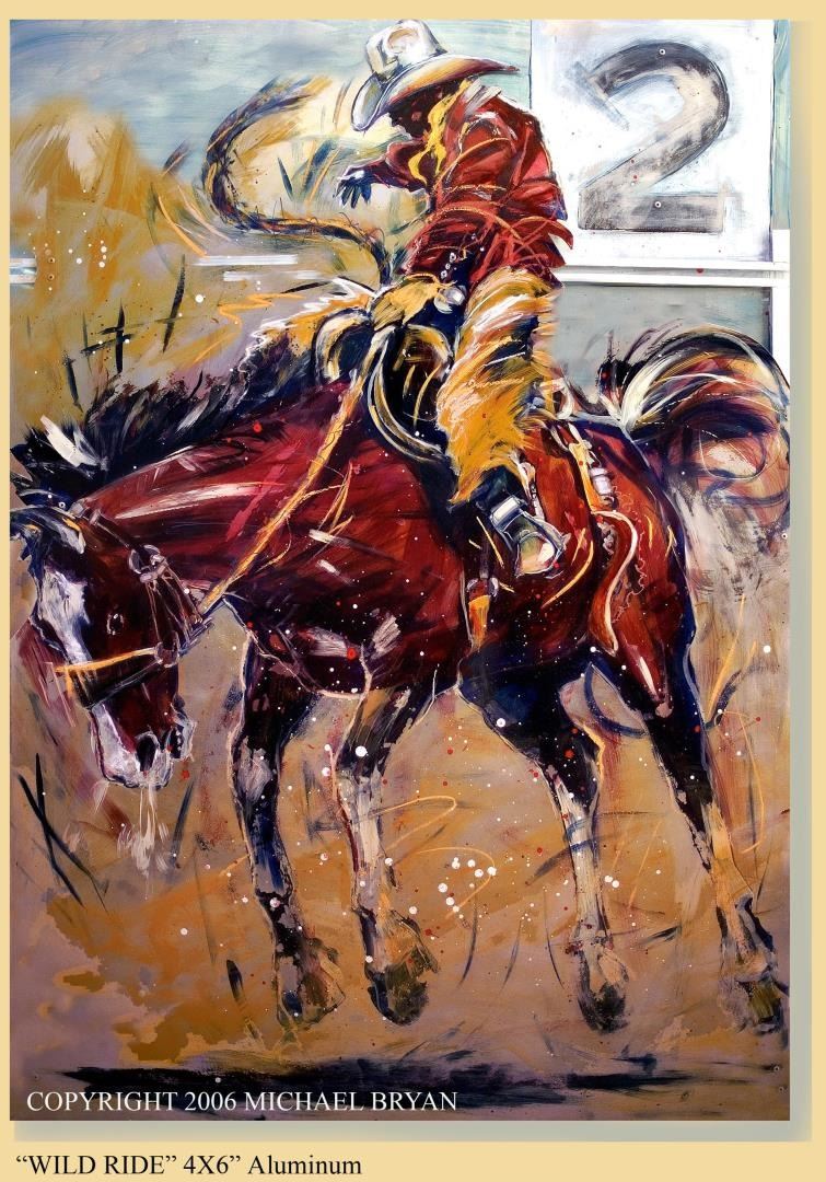 Michael Bryan captures the danger & the thrill of Rodeo in this brilliantly colored painting of a man vs a wild mustang; in a handworked giclee on canvas, 28x40" numbered 1/1 Unique.