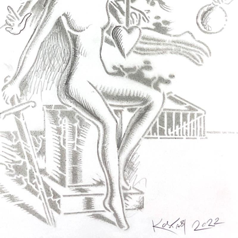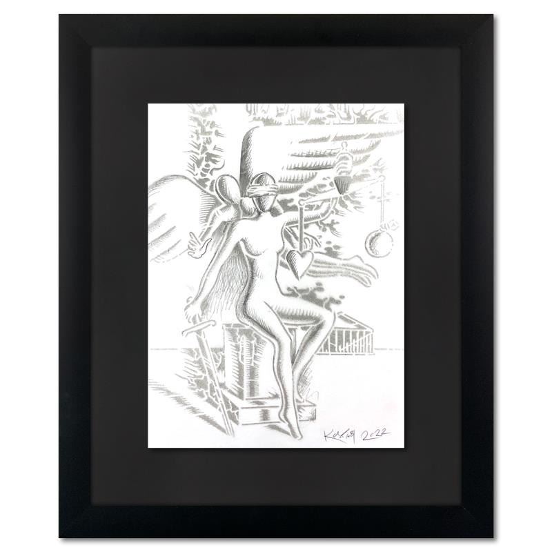 "Will Justice Prevail?" is an original drawing on paper by Mark Kostabi, dated 2022 and hand signed by the artist. This piece comes custom framed. Includes Certificate of Authenticity. Measures approx. 15" x 18" (frame), 9" x 12" (image).